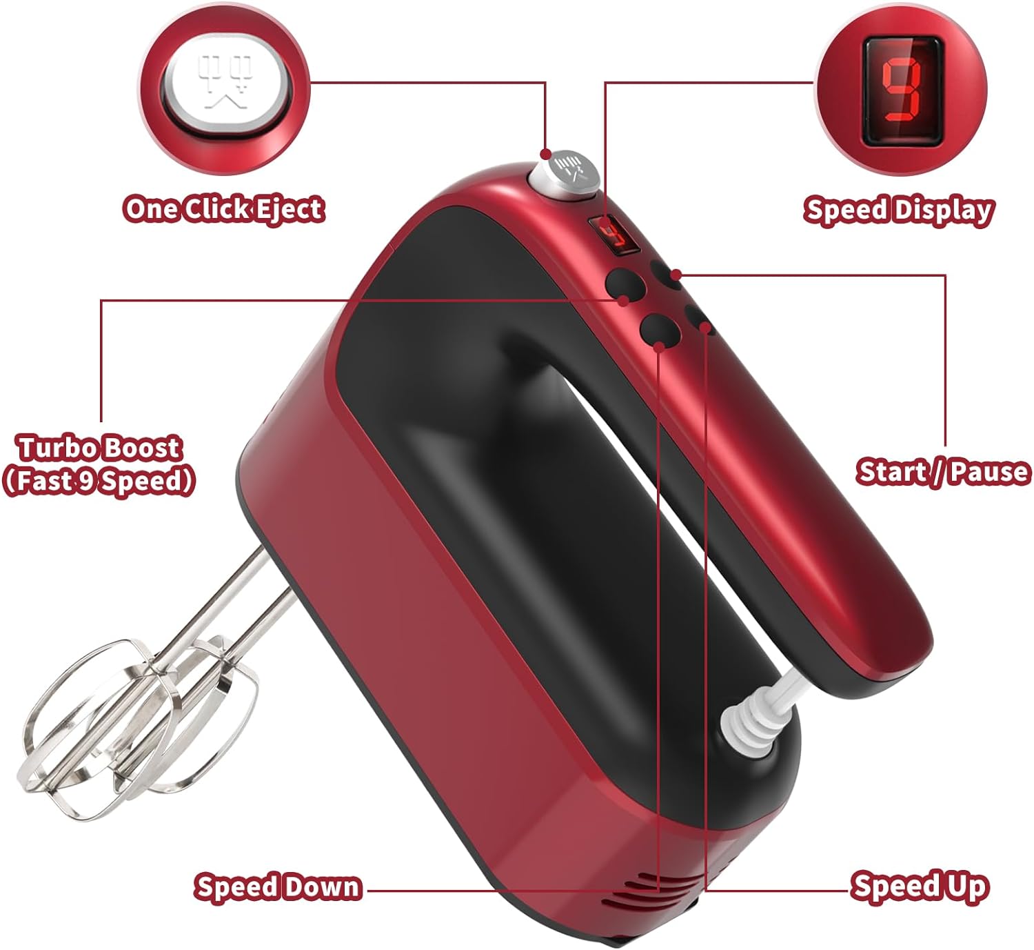 9-Speed Digital Hand Mixer Electric, 400W DC Motor, Hand Mixer electric Handheld with Snap-On Storage Case, Touch Button, Turbo Boost, 5x Stainless Steel Accessories (Red)