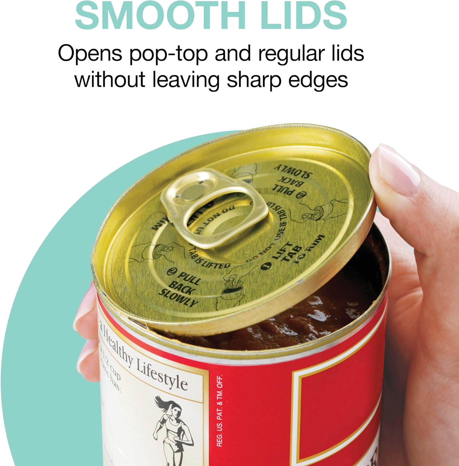 - SMOOTH, TOUCHABLE LID EDGES β This automatic can opener cuts cans along the side, eliminating sharp edges on both pop-top or regular cans. The blade stays clean because it doesn't touch food, and the lid can be reused to store leftover canned food in the fridge.