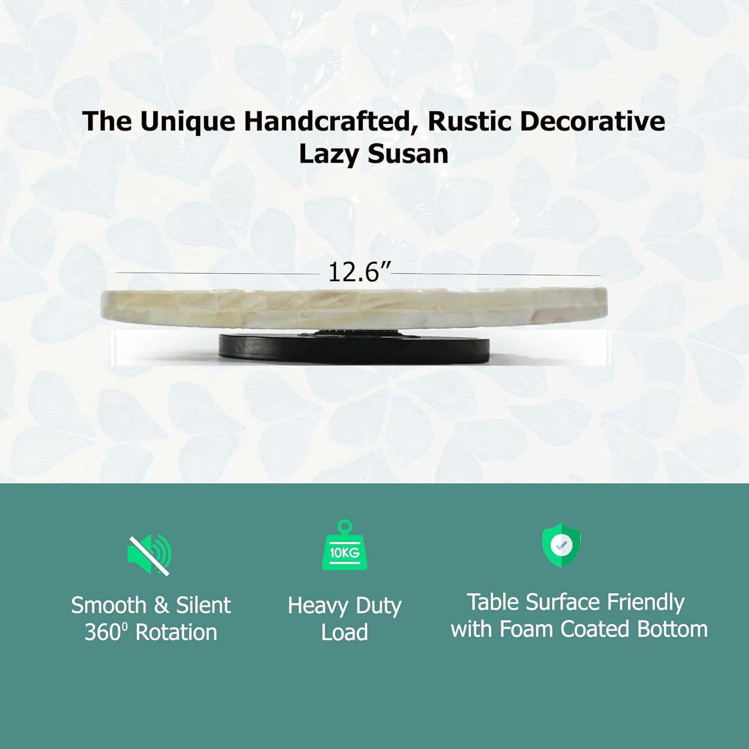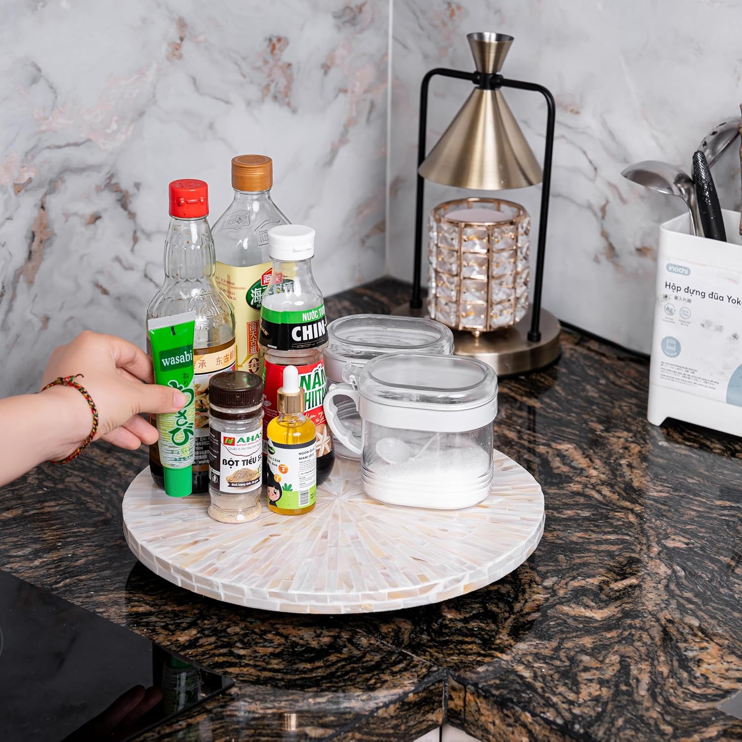 PEMAR PEMAR Mother of Pearl Lazy Susan Turntable – 12.6″ Decorative Wooden Rotating Tray Countertop Organizer (White Cream Sunlight/Starburst Pattern)