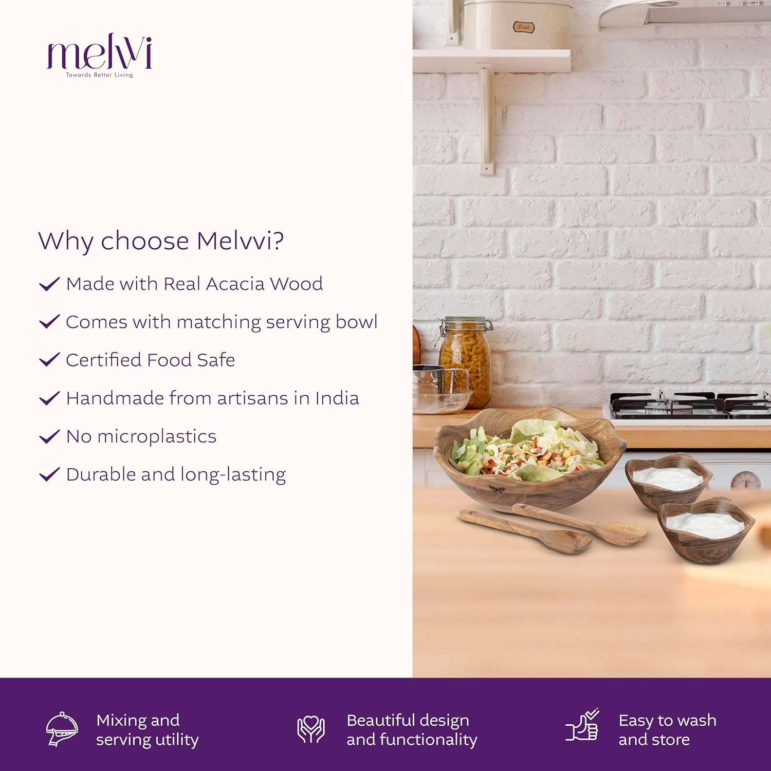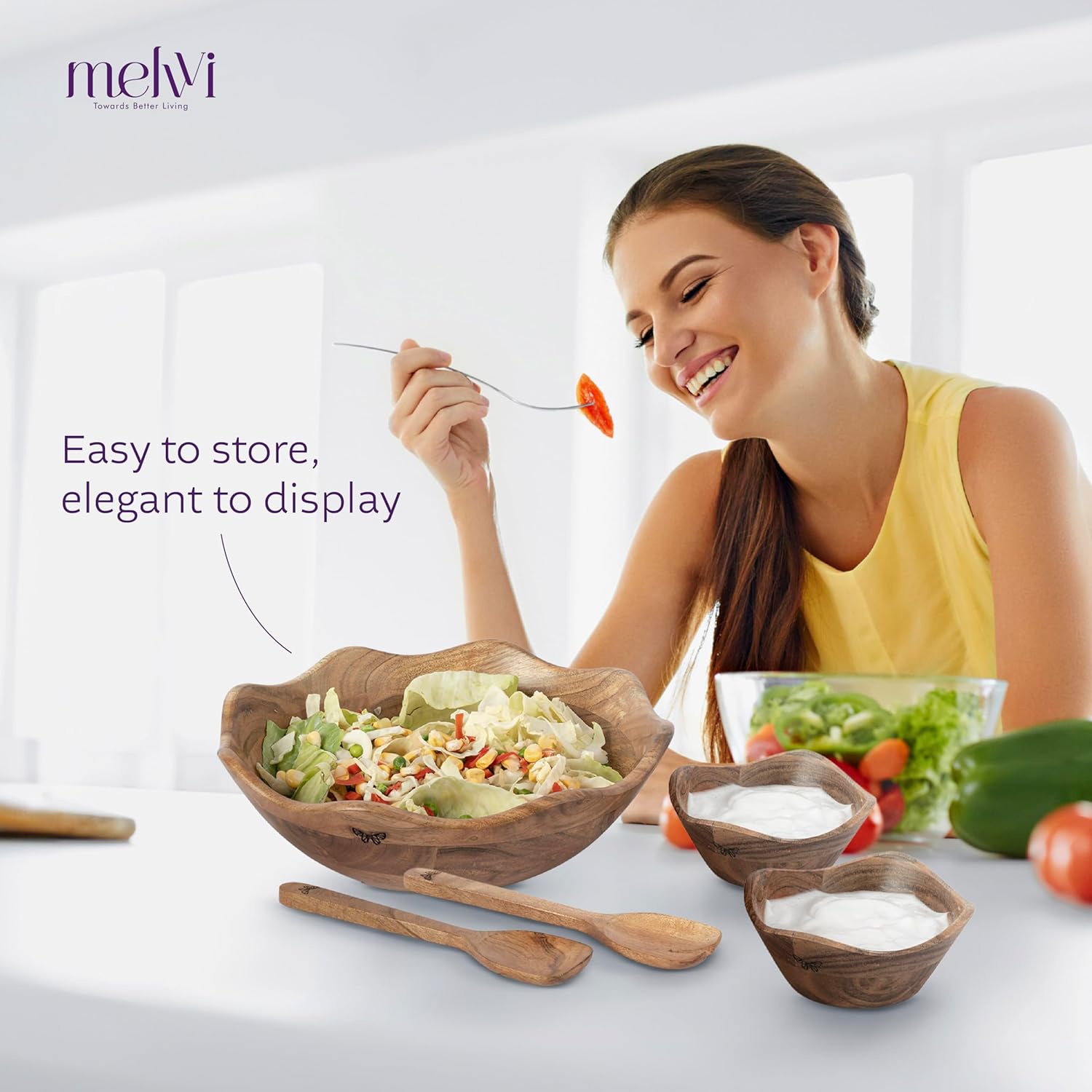 Melvvi Large Wooden Salad Bowl Set with 2 Small Bowls and 2 Serving Utensils | 12" & 6" Acacia Wood Bowls for Food | Great Gift for Kitchen & Dining (Natural Set of 5) (Natural Set of 5)