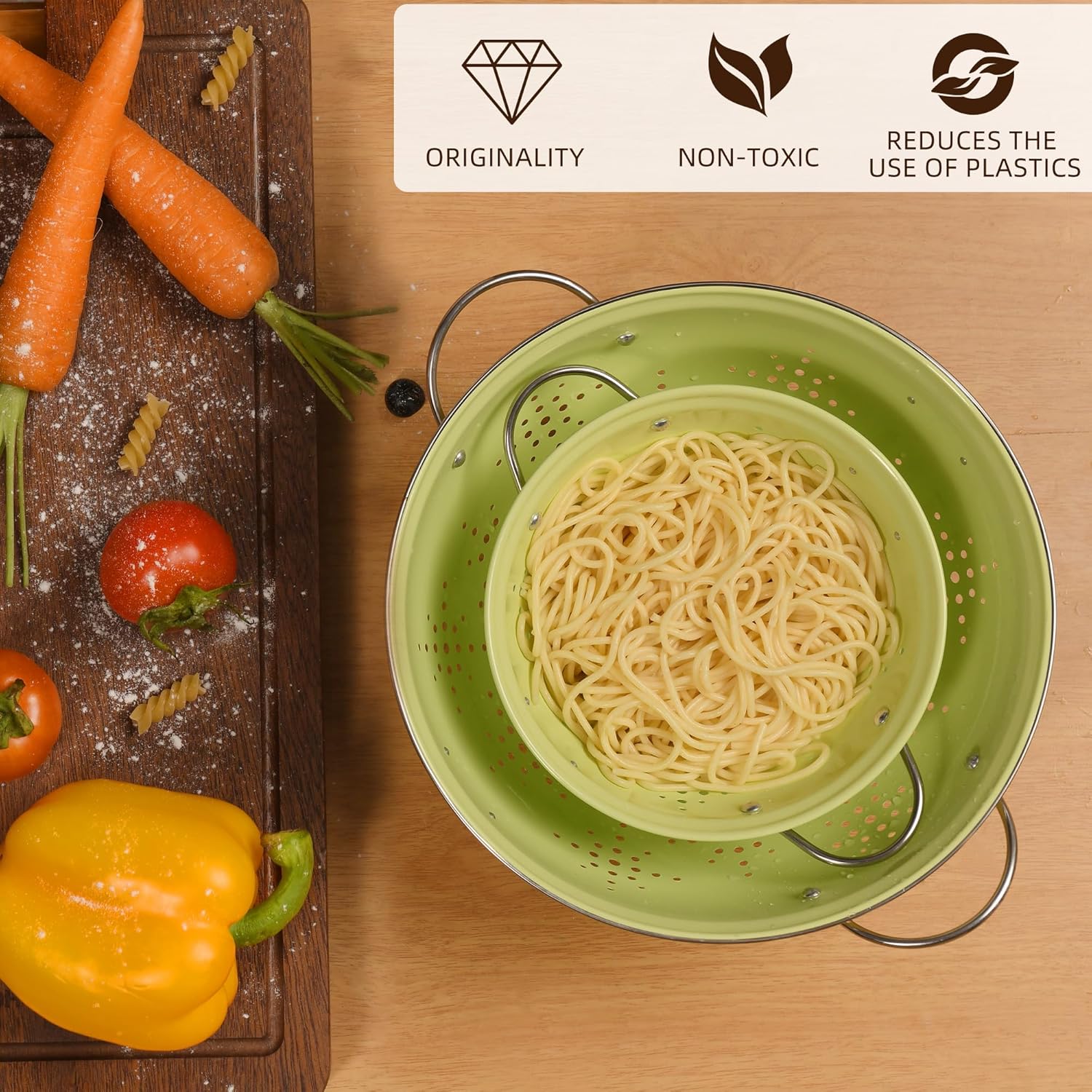 Metal Colander 2 Pack, Strainer Bowel with Handles 2Qt & 6Qt Powder Coated Solid Ring Base Heavey Duty Kitchen Drainer Basket for Pasta Veggies and Fruits,New Home Apartment Essentials (LightGreen)