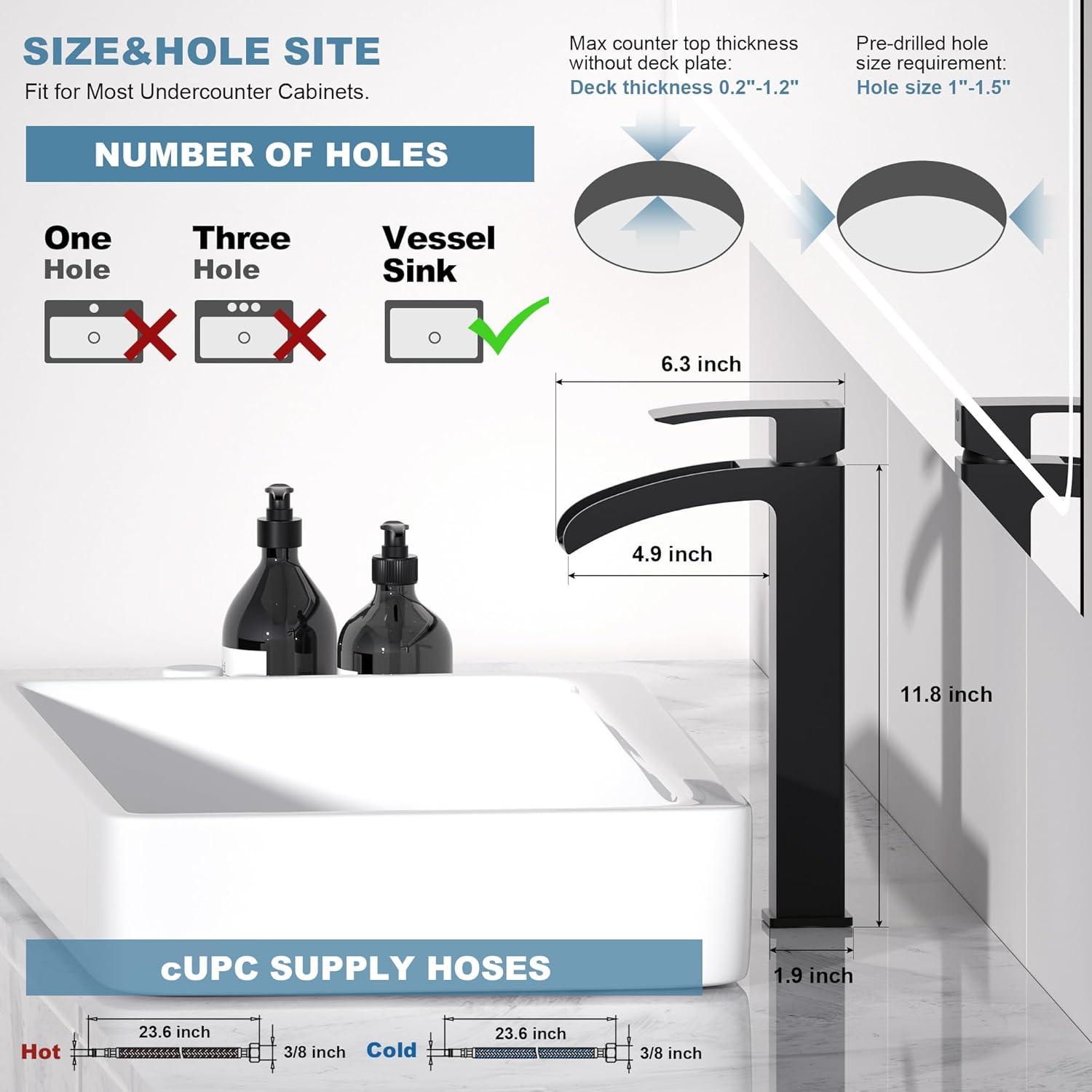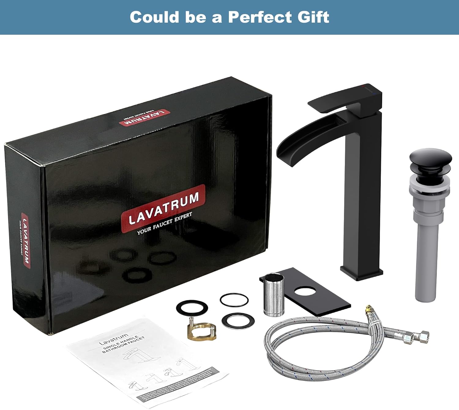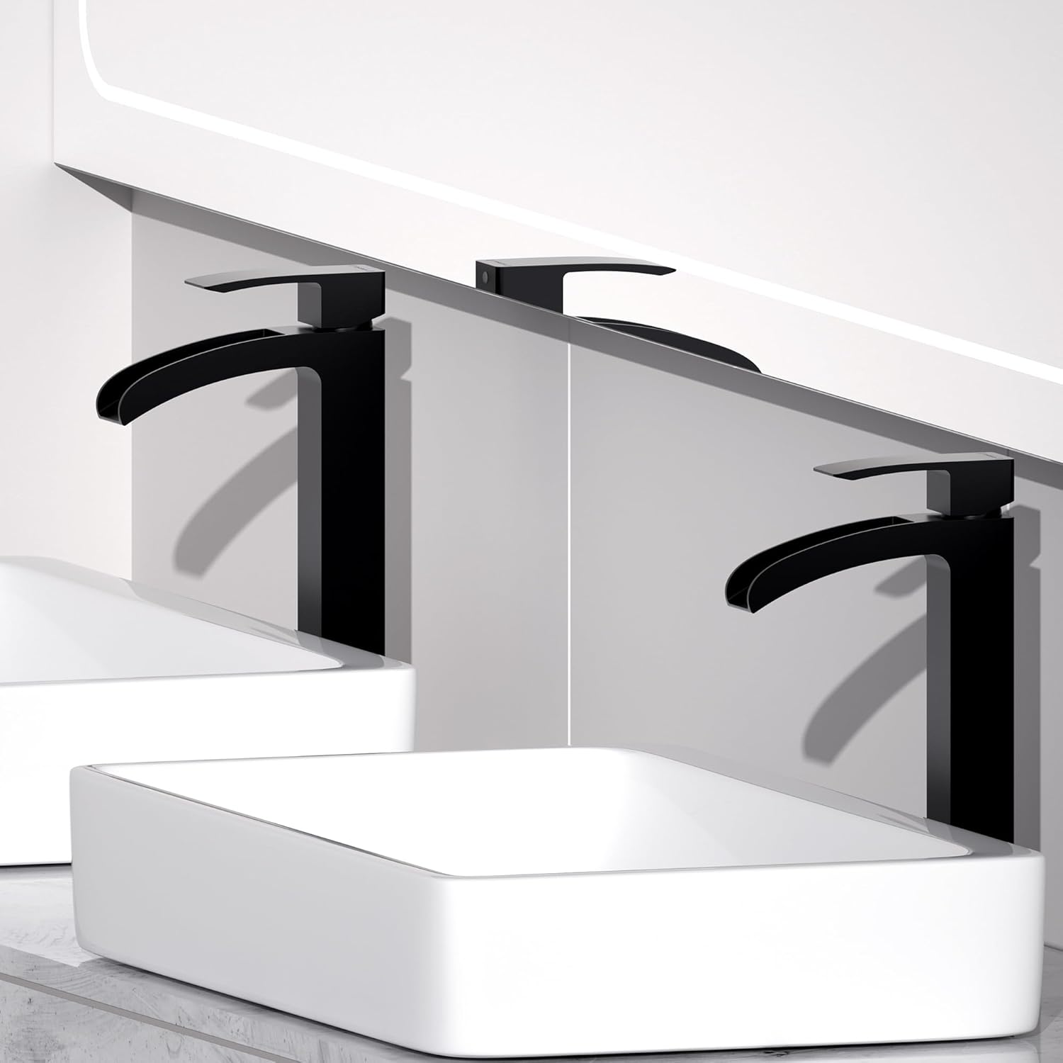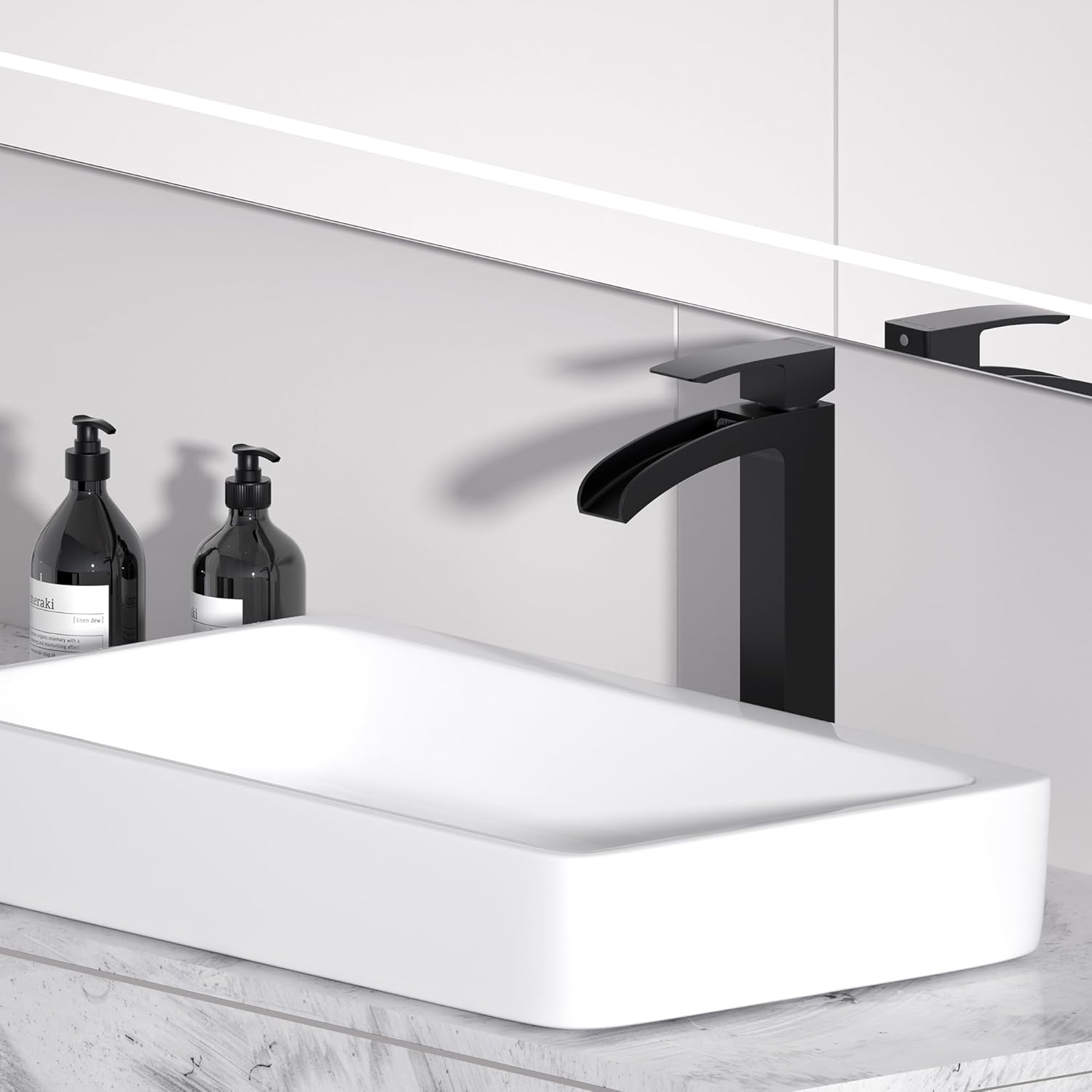 Bathroom Faucet Tall Vessel Faucet Matte Black Waterfall Deck Mount Single Handle Lavatory with Water Supply Line Lavatory Vanity