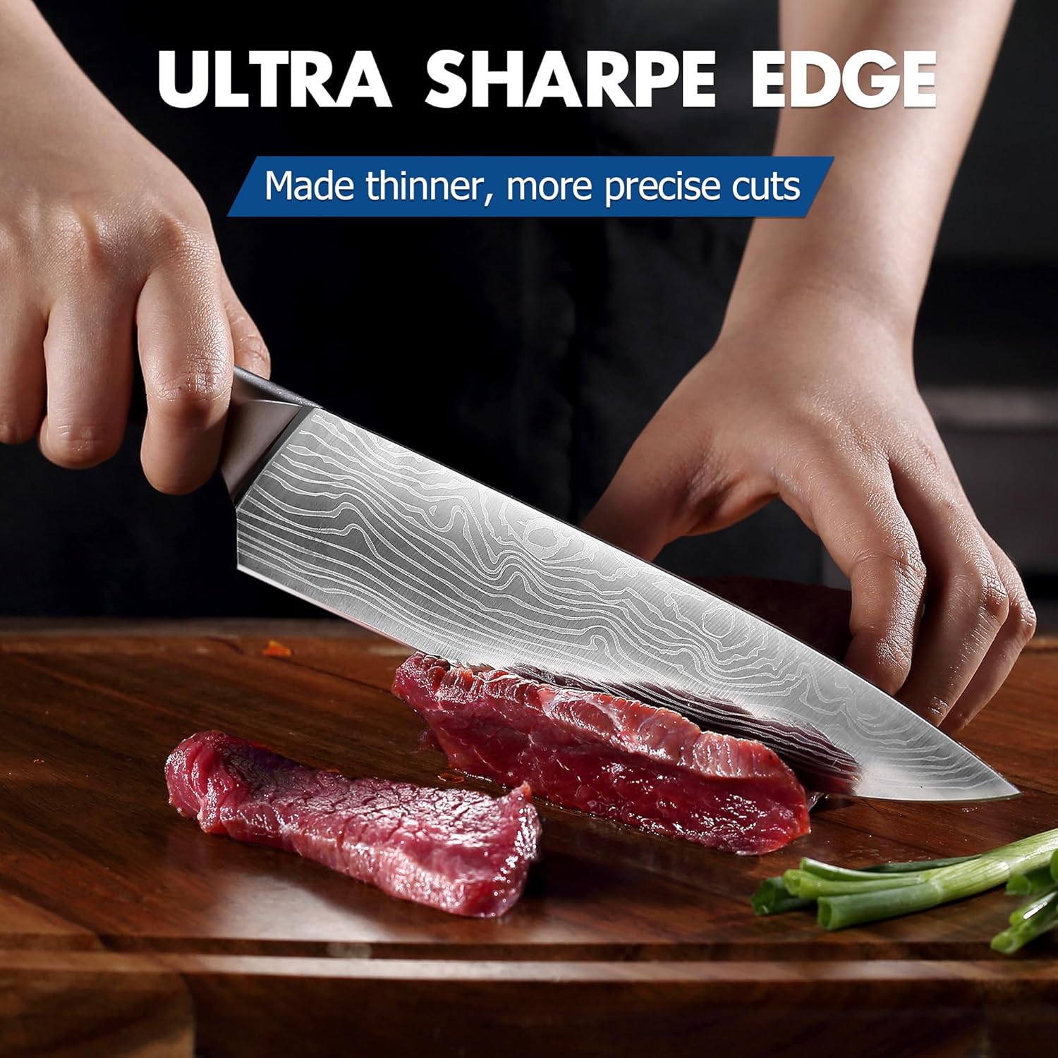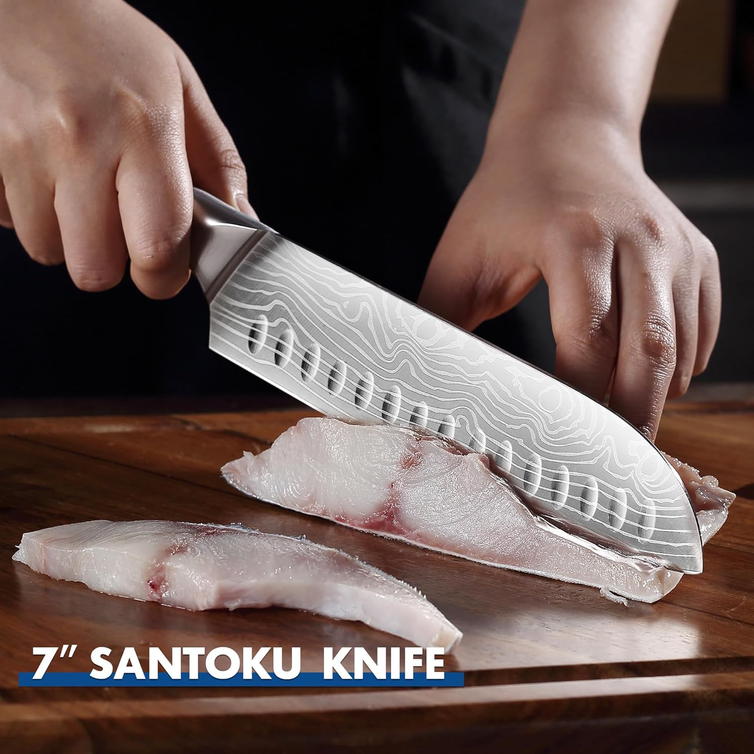 - Multifunctional Knives Set:This knives set for kitchen easily handles your everyday kitchen tasks like chopping, slicing, chopping, chopping fruits, vegetables and a variety of meats including fish, chicken and beef.The concave pattern designed on the blade not only improves the aesthetics, but also reduces the cutting resistance and prevents the meat from sticking to the blade. It is truly an all-rounder cooking knife and the first choice of home cooks and professionals alike