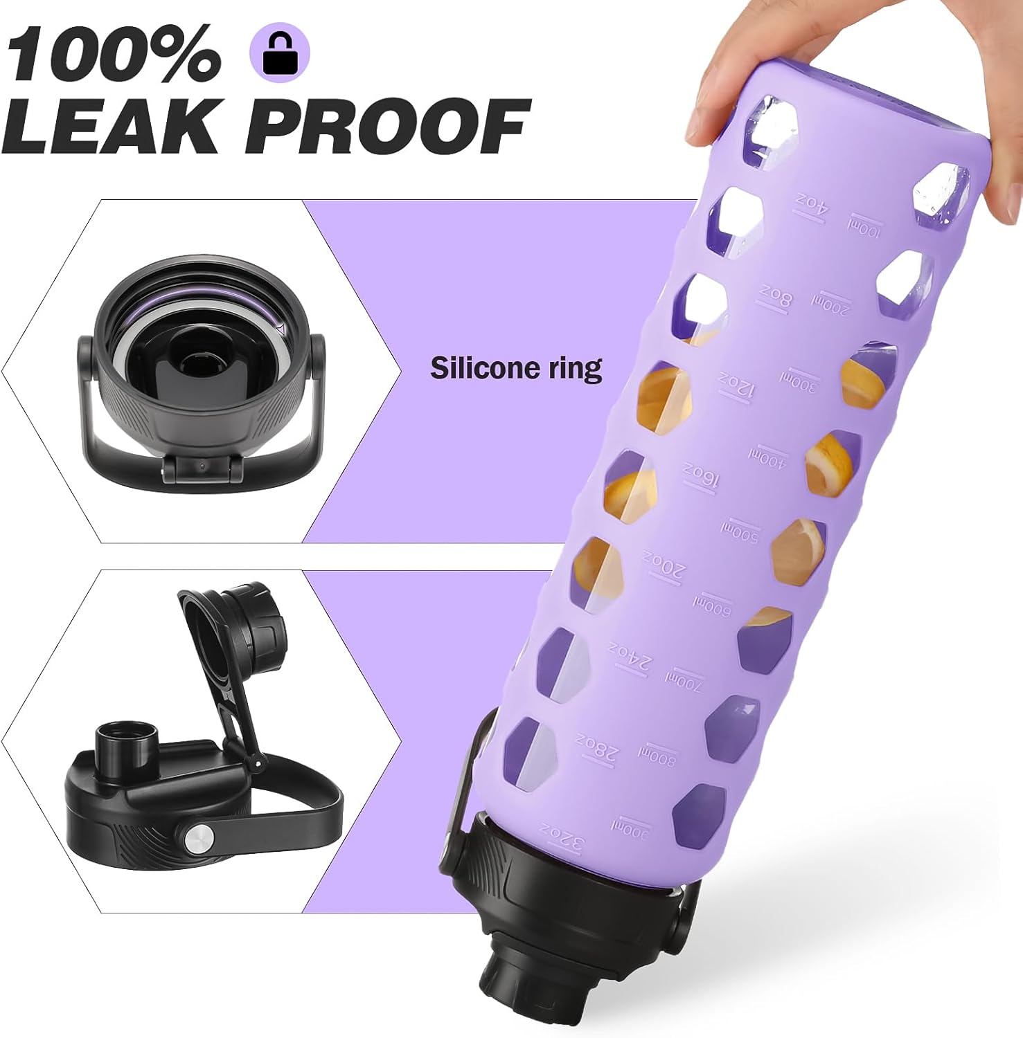 MUKOKO Glass Water Bottles, 32oz Glass Tumbler with Straw, Drinking Bottles with 2 Lids-Handle Spout Lid&Bamboo Straw Lid, Motivational Water Bottle with Time Marker and Silicone Sleeve, 1 Pack-Purple