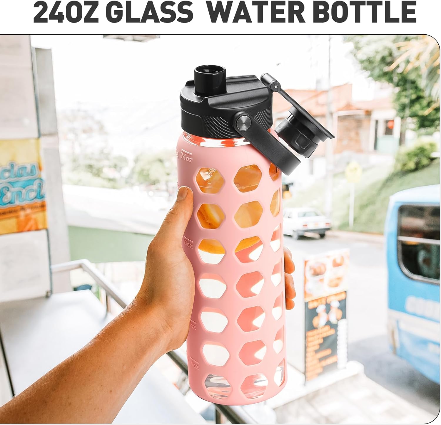 - GLASS WATER BOTTLES WITH TIME MARKER:MUKOKO 24oz glass water bottle with time marker preserves the purity of water.This is a very handy way to keep up with daily water intake,stay hydrated and healthy.
