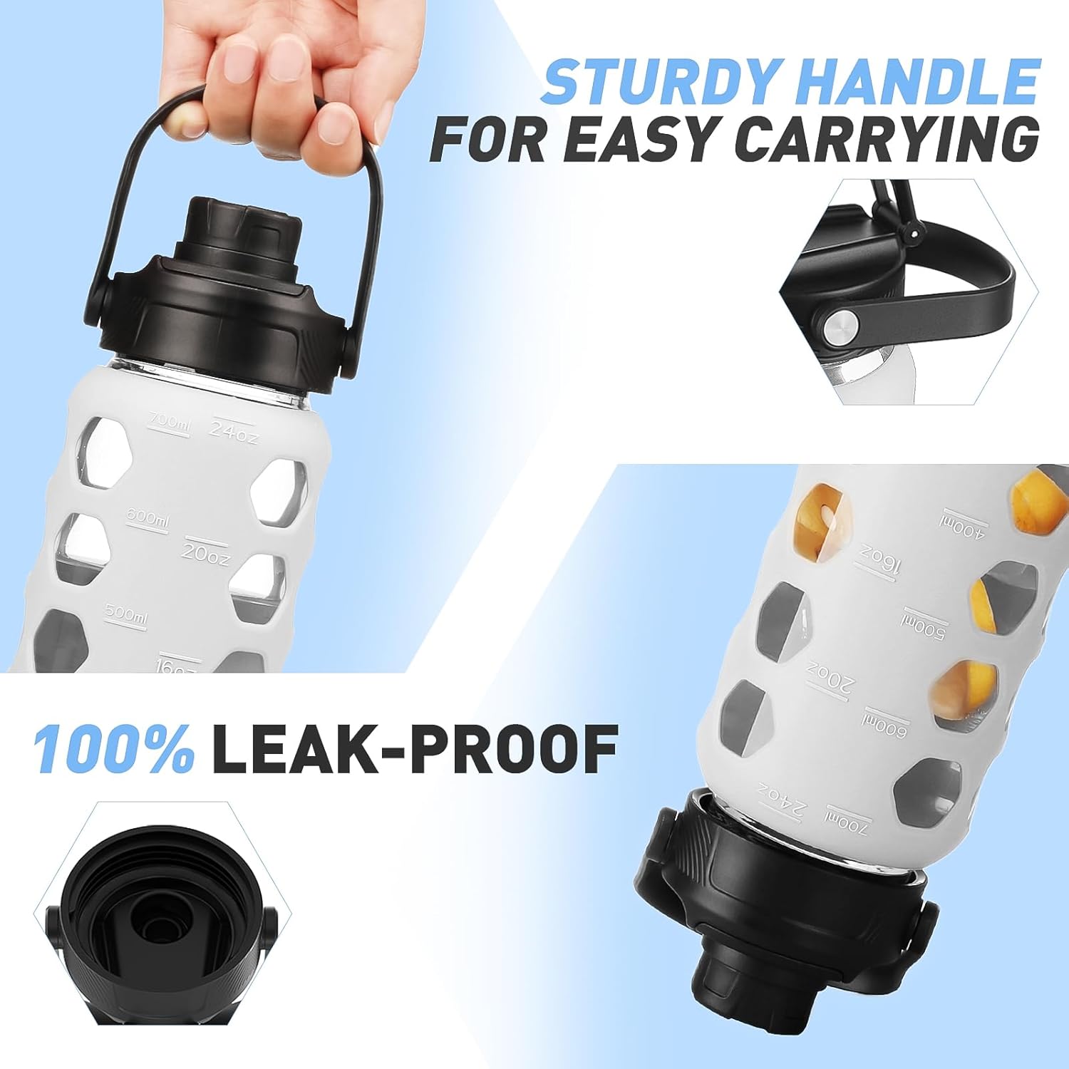 MUKOKO Glass Water Bottles, 24oz Glass Tumbler with Straw, Drinking Bottles with 2 Lids-Handle Spout Lid&Bamboo Straw Lid, Motivational Water Bottle with Time Marker and Silicone Sleeve, 1 Pack-White