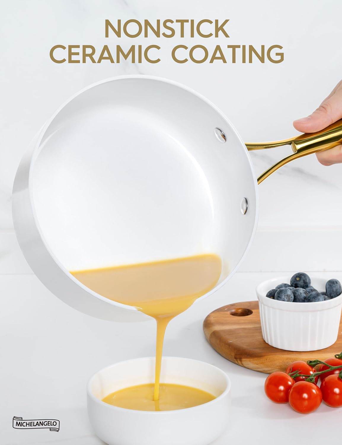 - Stunning Kitchen Artwork β Bring a touch of elegance to your kitchen with this sleek ceramic saucepan, complete with beautiful gold stainless steel handles.