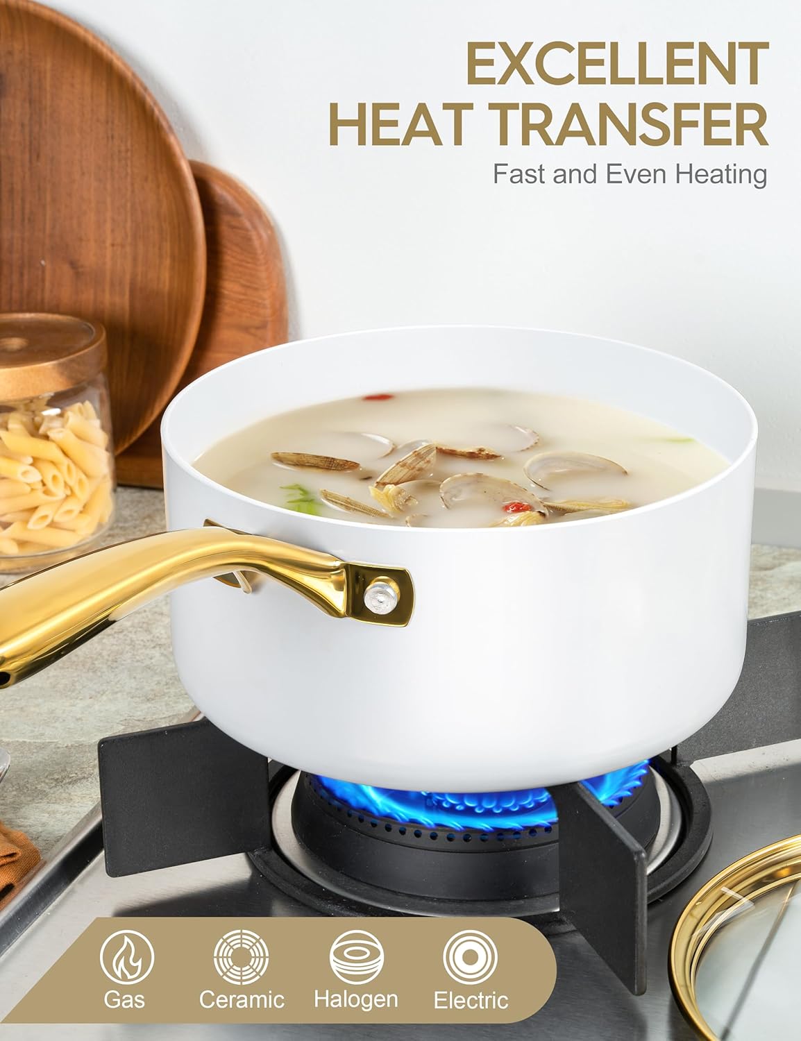 - Stunning Kitchen Artwork β Bring a touch of elegance to your kitchen with this sleek ceramic saucepan, complete with beautiful gold stainless steel handles.