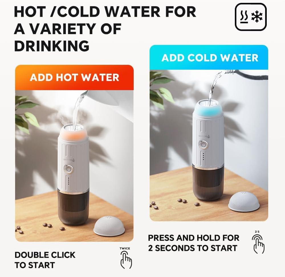 - Warm Tips: The coffee maker's performance may vary slightly when the battery capacity is low. Therefore, it is essential to remember to charge it before embarking on long travels to ensure continuous usage.
