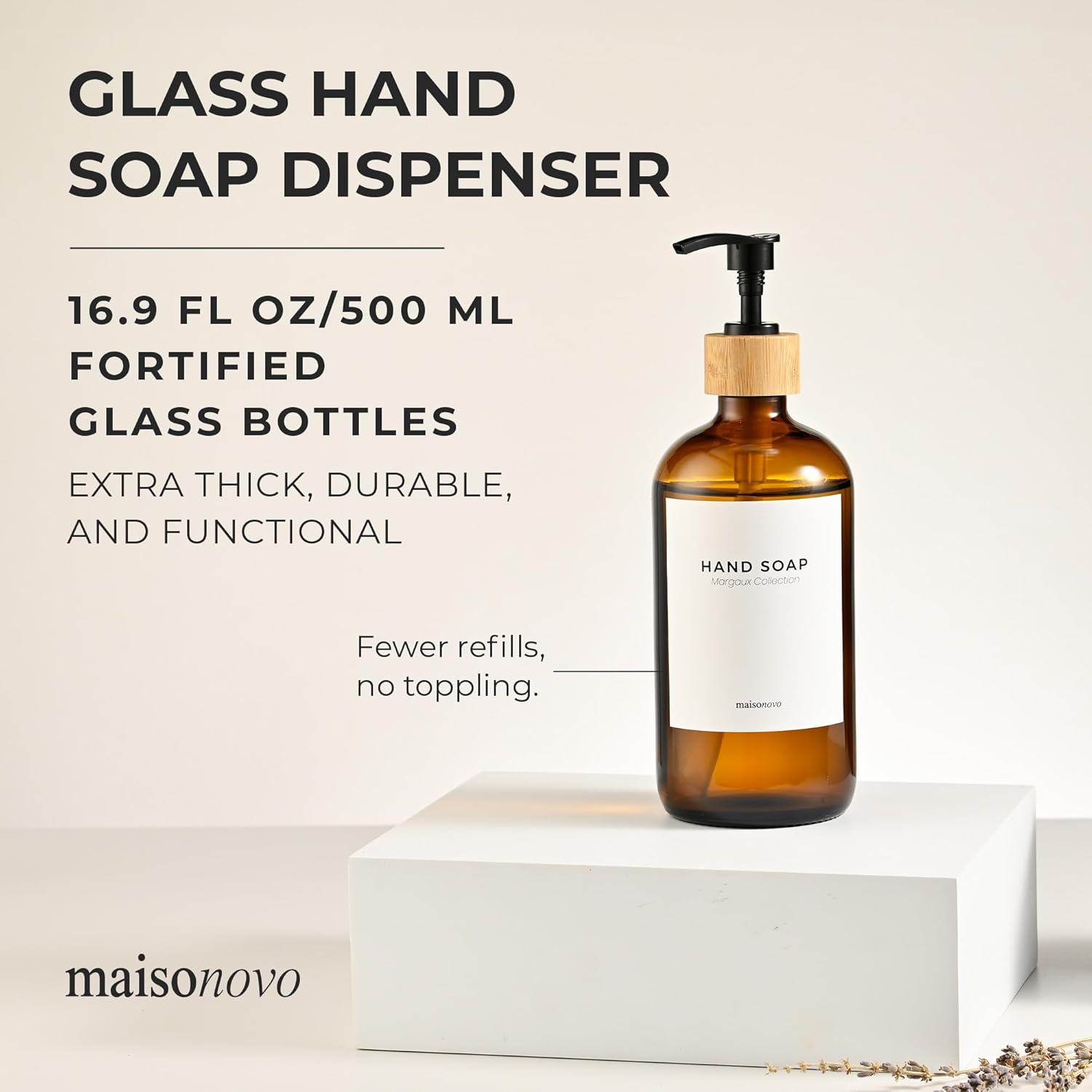 MaisoNovo Glass Hand Soap Dispenser | Dish Soap Dispenser for Kitchen | 16.9oz Amber Bottles with Black Bamboo Pump | Bathroom Lotion Dispenser