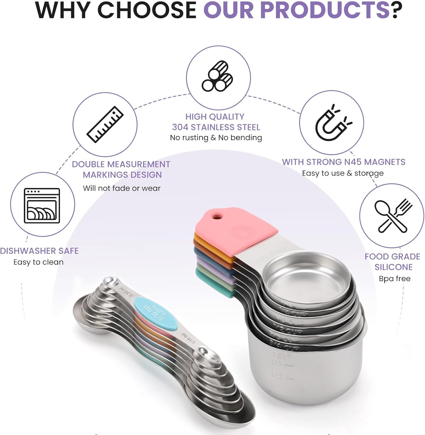 - Magnetic measuring cups set:Double-sided magnetic stainless steel measuring cup is made of matte 304 high-quality stainless steel, with matte appearance and texture. Its silicone fingerprint non-slip particle handle is comfortable, non-slip and easy to grip. This Measuring cups set includes:1 cup, 3/4 cup, 2/3 cup, 1/2 cup, 1/3 cup, 1/4 cup, 1/8 cup.