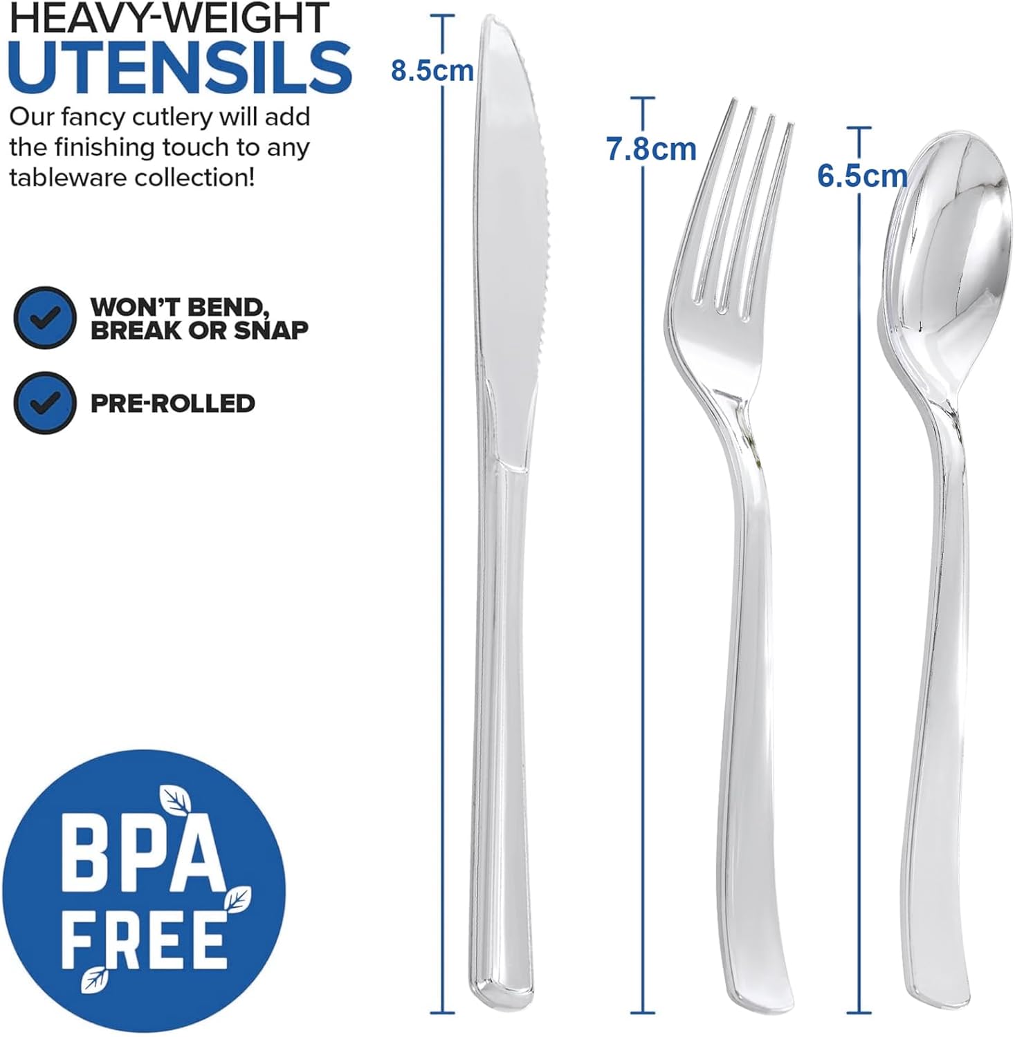 - Value Packaging: This is a large capacity packaging of silver disposable flatware. The 100 pack includes 100 forks, 100 knives, 100 spoons, and 100 wrapped napkins. This wrapped disposable silverware set is perfect for large parties or weddings.