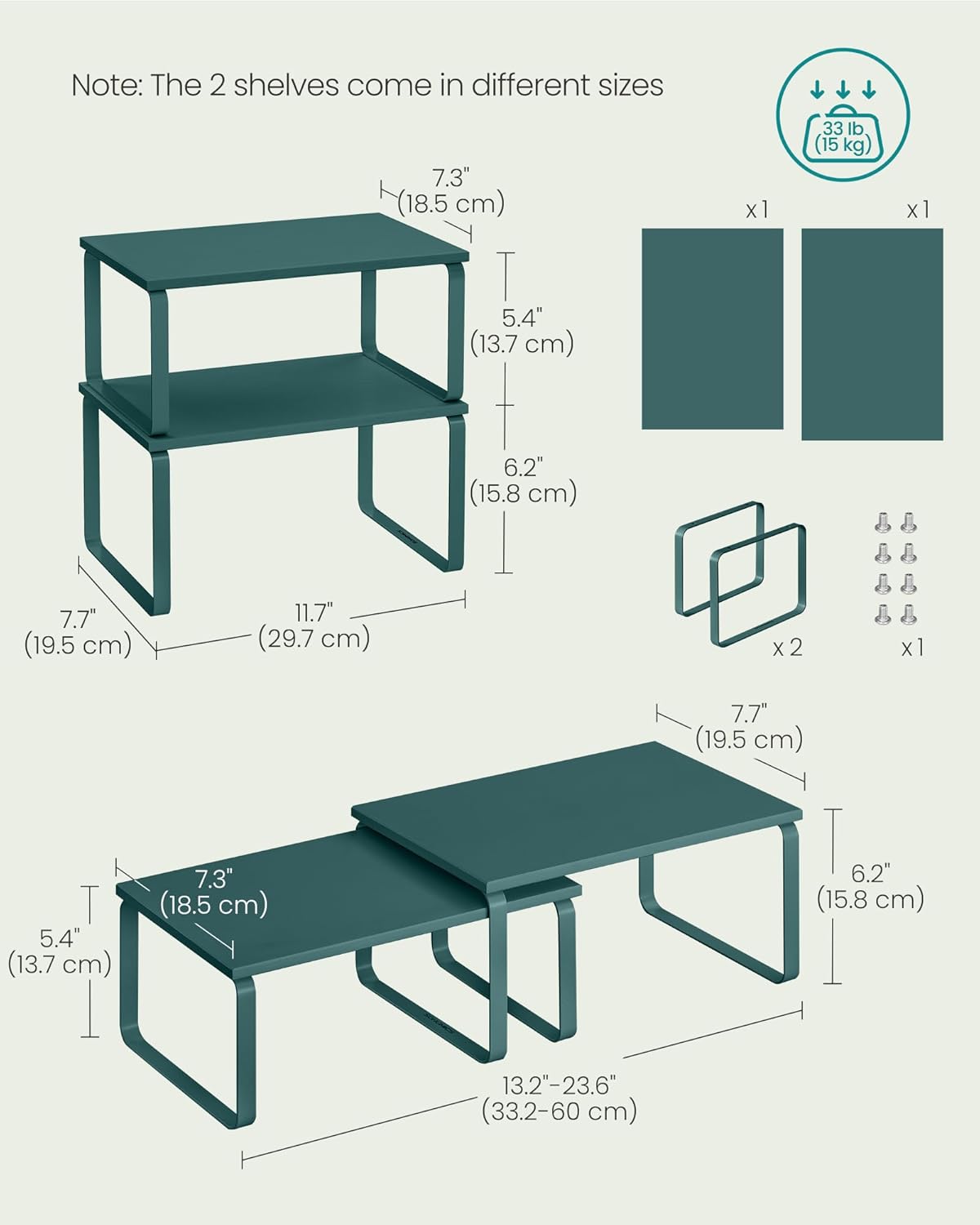 - [Adjustable] With their unique design, with one slightly smaller than the other, these shelf organizers can be stacked on top of one another, nested, used separately, or even in an L-shape. Adjust them how you want to perfectly fit your kitchen space
