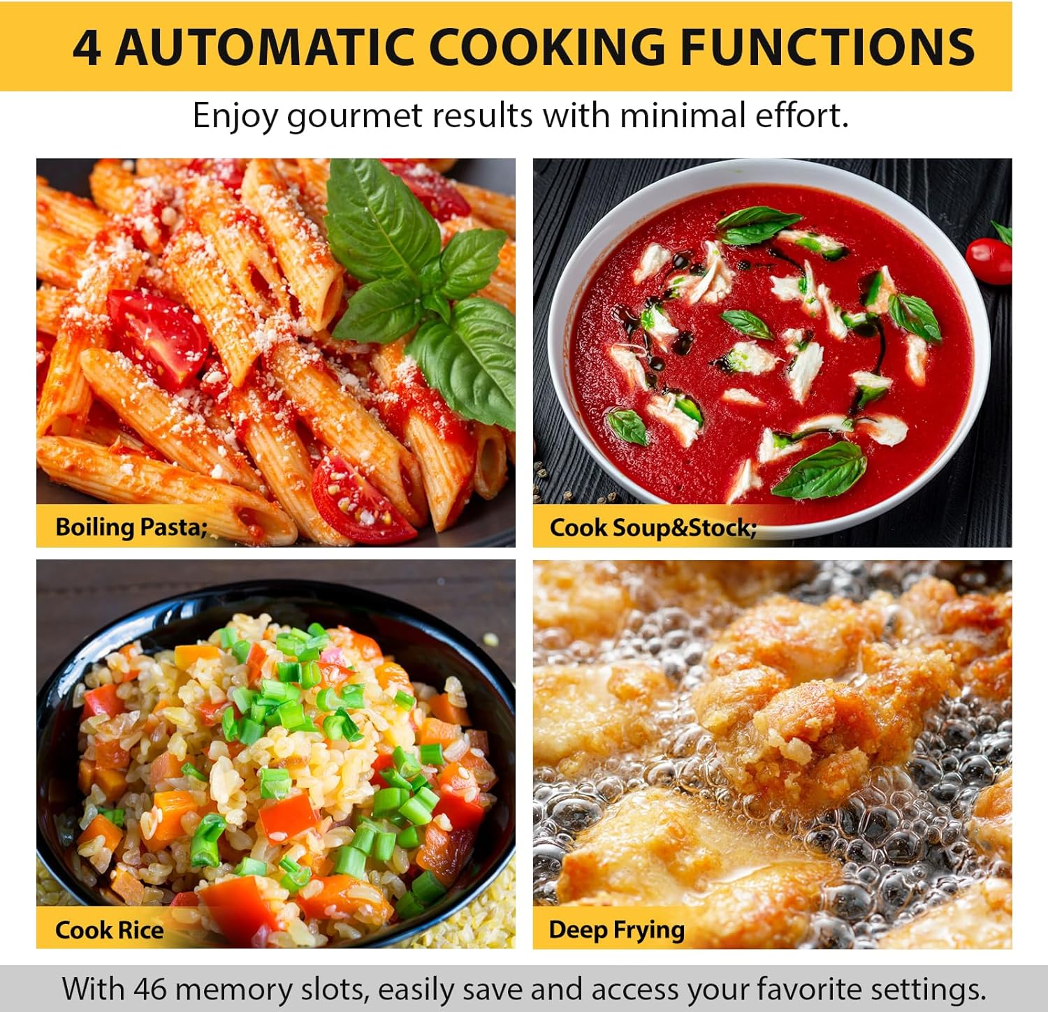 - 4 NEW PROGRAMMED RECIPES – Experience the automated cooking with innovative programmed recipes. Featuring 4 crafted options—boiling pasta, creating soup/stock, deep frying, and rice cooking—each function is rigorously tested for flawless results.