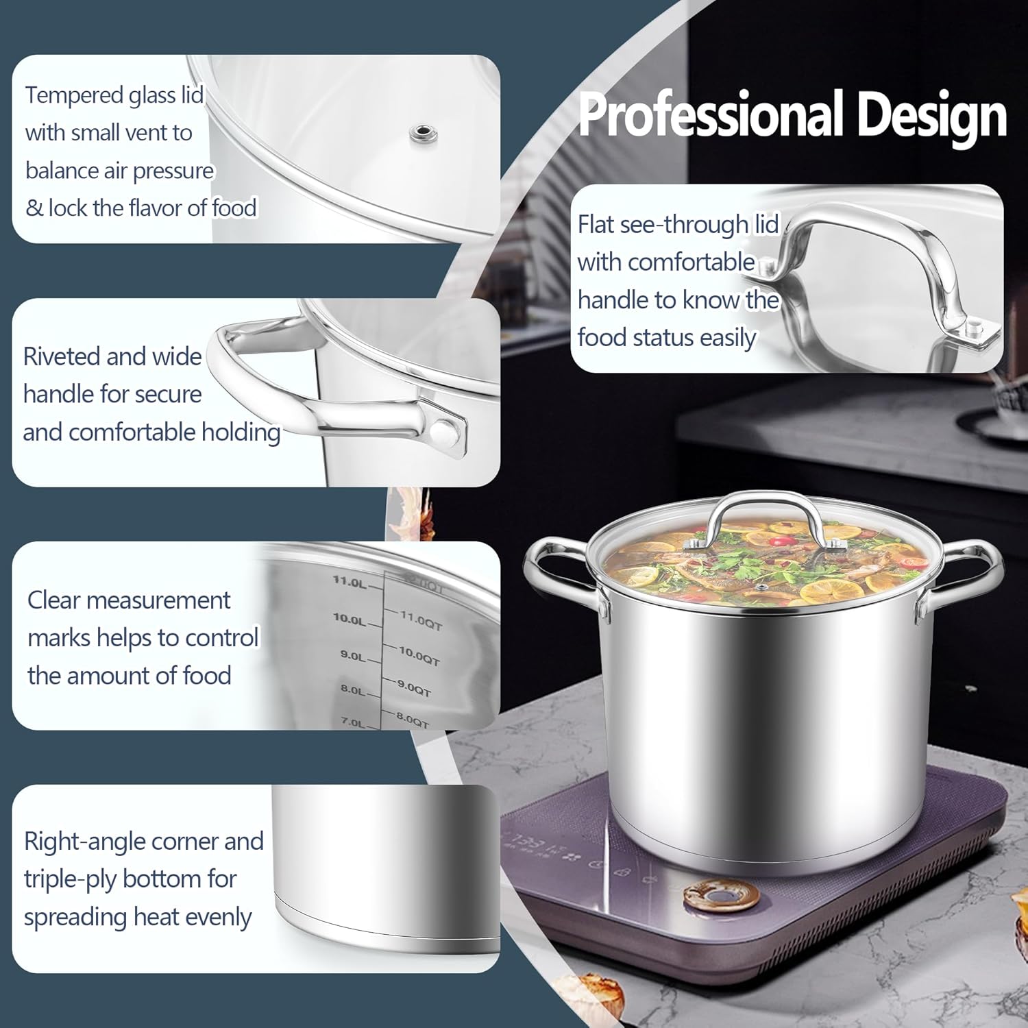 E-far 12 Quart Cooking Stock Pot, Large Stainless Steel Pot for Canning Simmering Stewing, Heavy Duty Cookware with Tri-ply Base for Induction Gas Stoves, Soup Pots with Glass Lid, Dishwasher Safe