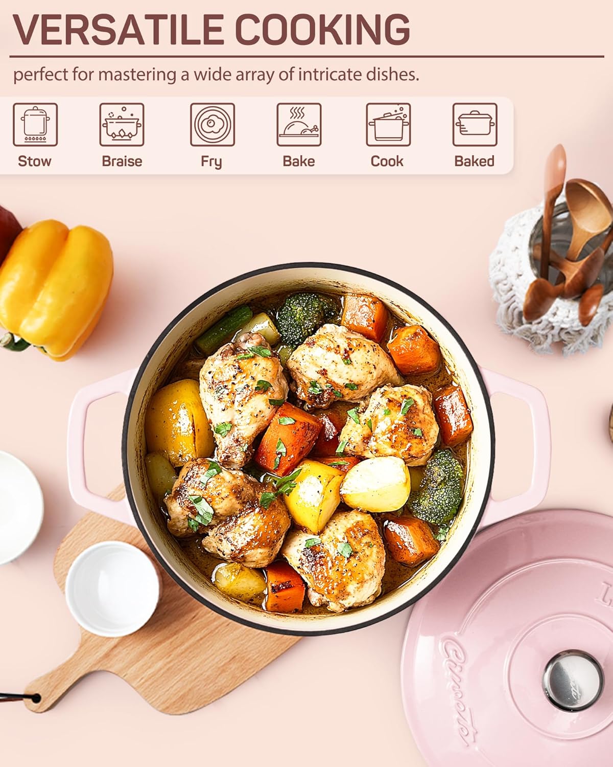 6 QT Dutch Oven Pot with Lid, Enameled Cast Iron Dutch Oven for Bread Making, Braiser, Cooking, Dual Handles, Oven Safe up to 500° F or on Stovetop, Gifts for Family - Pink