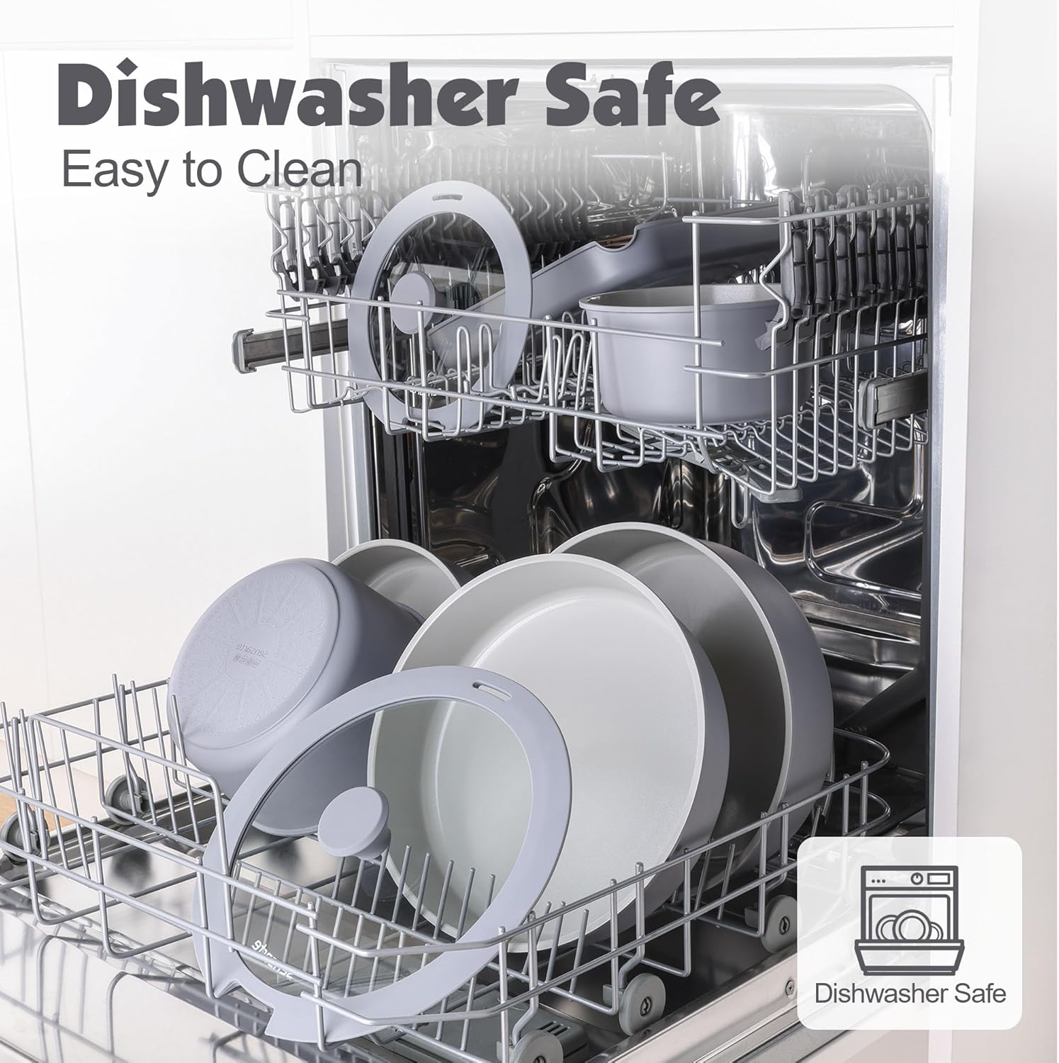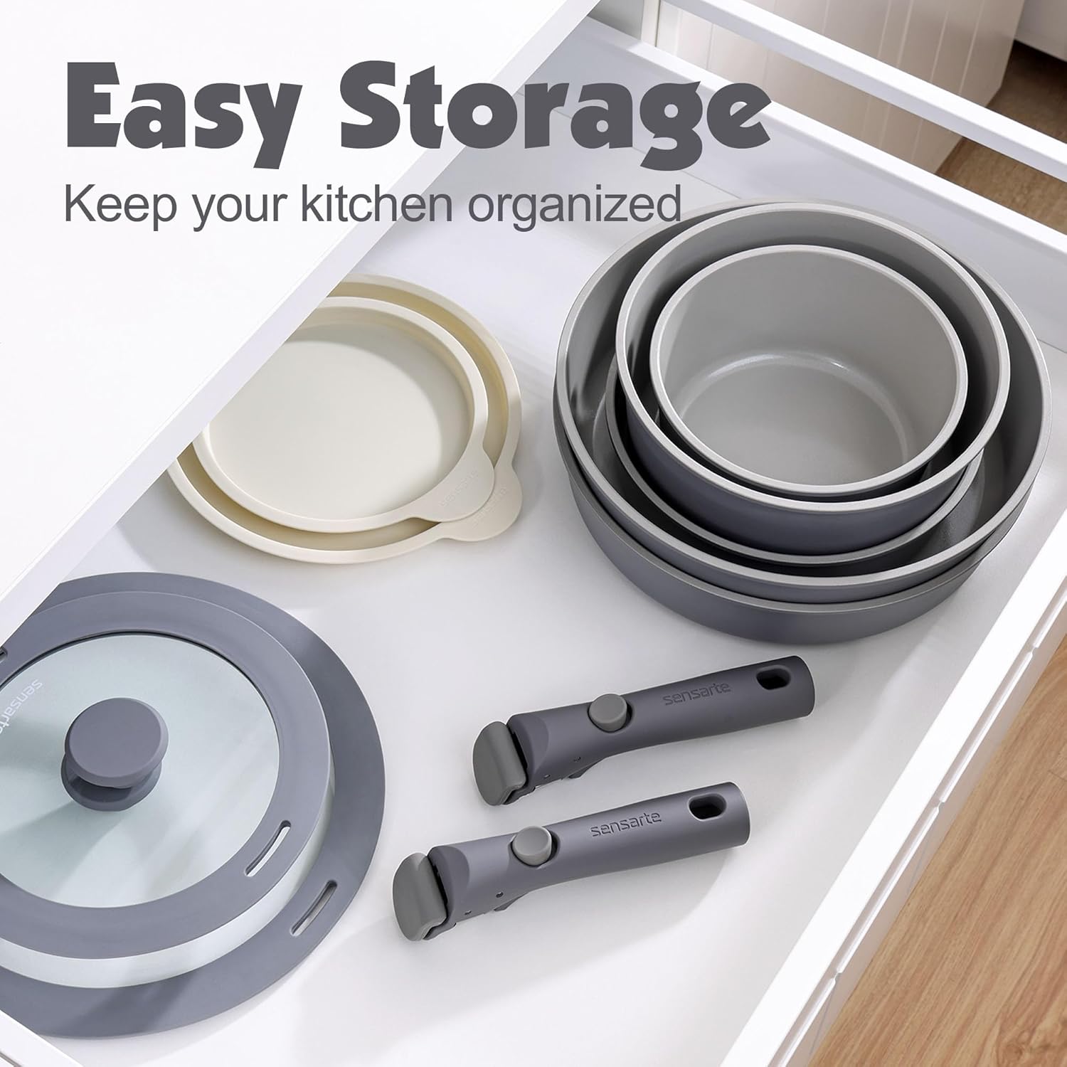 SENSARTE 17 Piece Ceramic Pots and Pans Set, Nonstick Detachable Handle Cookware, Induction Kitchen Cookware Set with Removable Handle, Dishwasher & Oven Safe (Gray)
