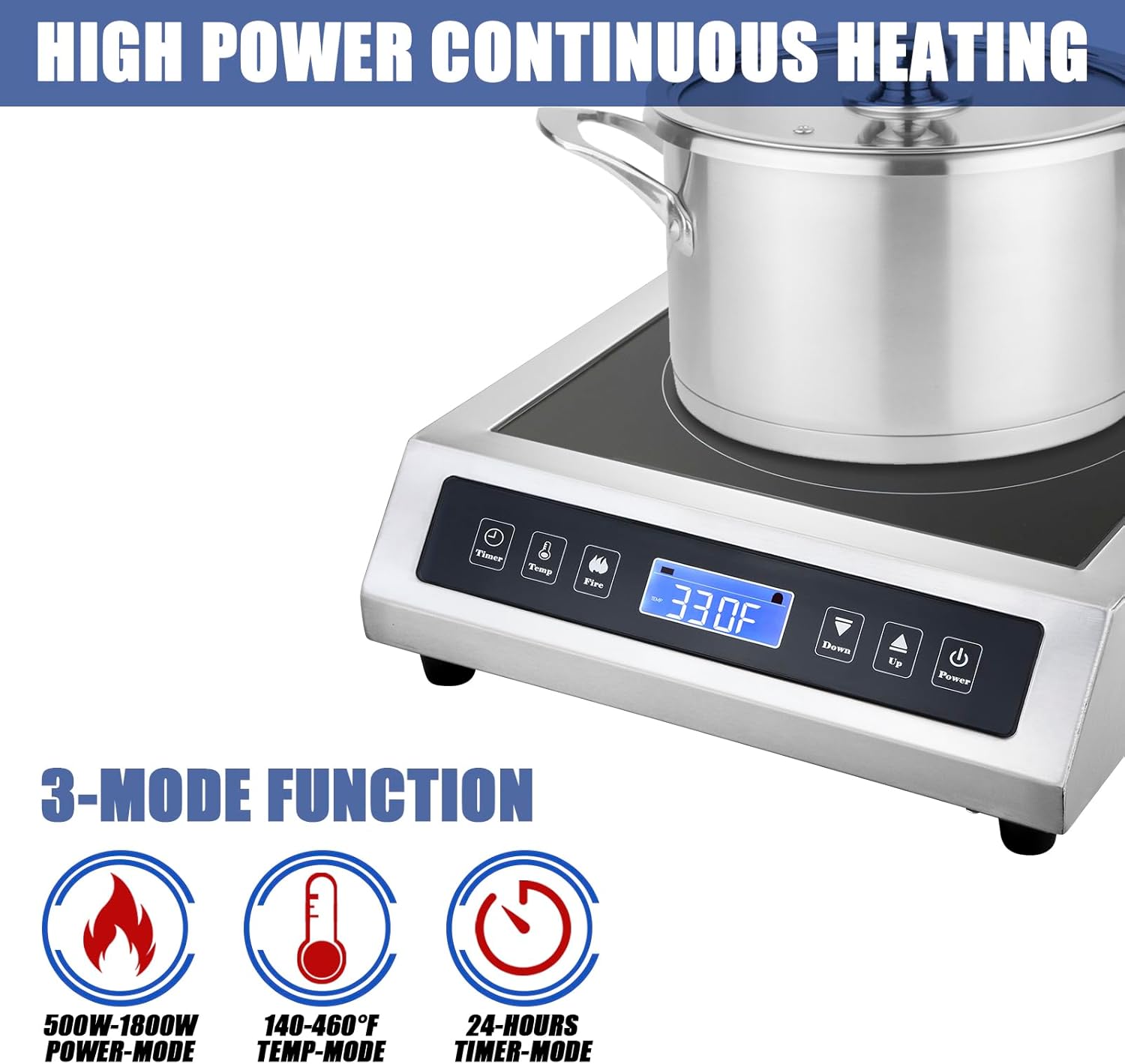 - HIGH EFFICIENCY: This commercial induction cooktop choose from 10 preset power levels (500W to 1800W) and 10 preset temperature level settings (140°F to 460°F). With an 83% energy efficiency rating, induction cooker is more efficient than traditional gas or electric stoves yet provides quick heat-up and faster cooking times.