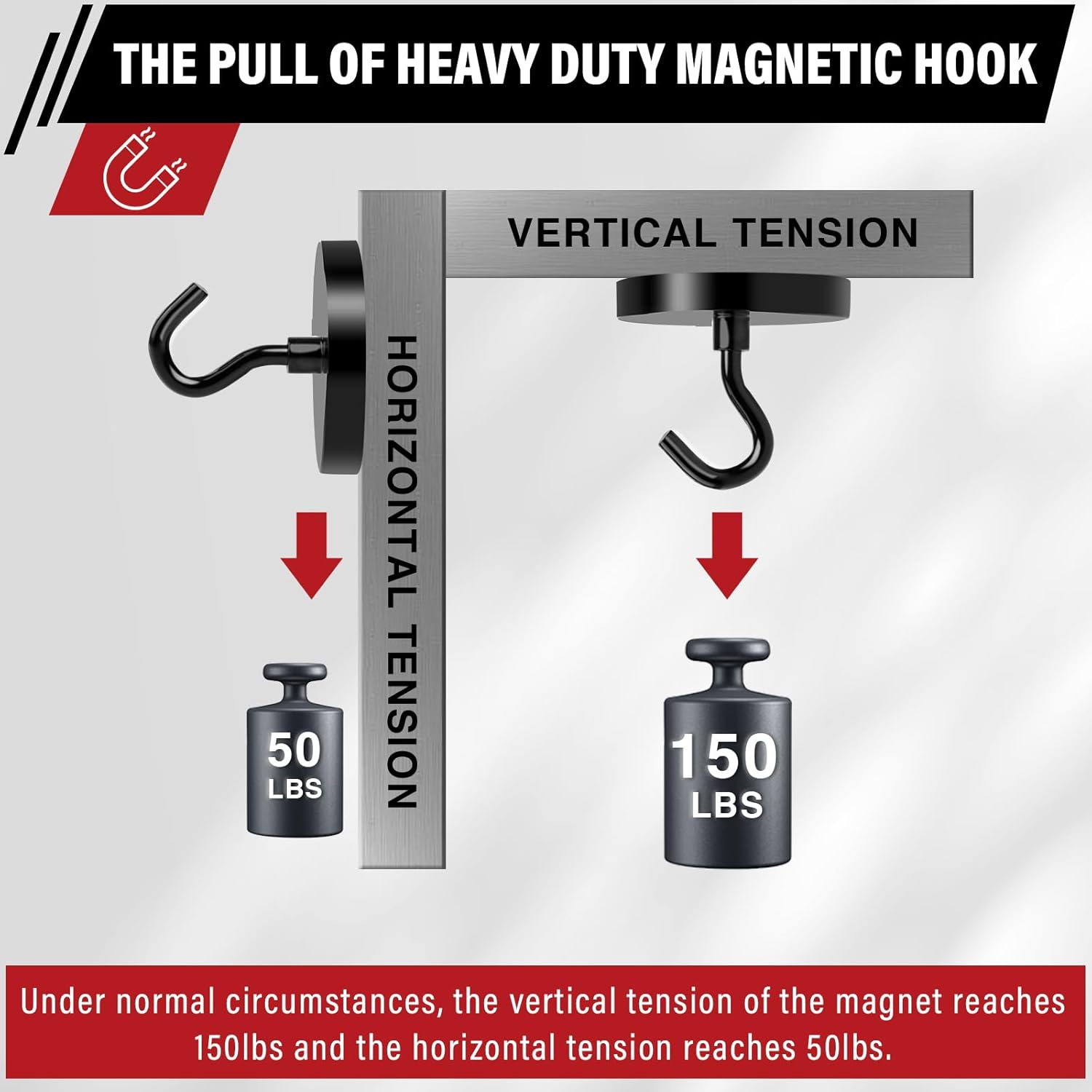 - 【STRONG MAGNETIC HOOKS】This magnetic hooks for hanging can support up to 150 pounds in vertical suspension and up to 50 pounds in horizontal suspension.The tension value we provide is the maximum ideal tension value measured by the machine,and the actual tension value that can be achieved in use is related to the material and thickness in contact.