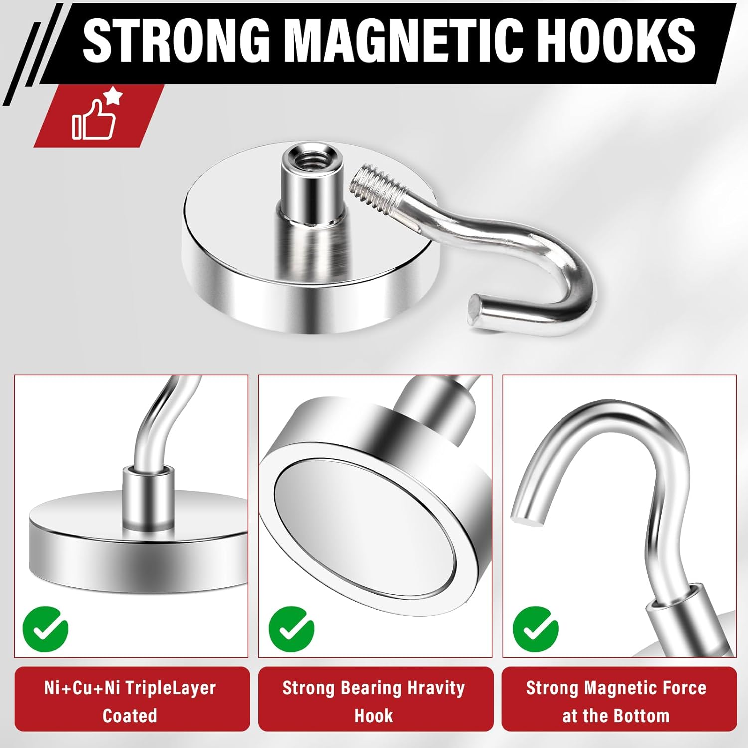 - 【HIGH QUALITY】The material of the magnetic hooks heavy duty is neodymium magnet and A3 high quality steel, which has excellent magnetic ability. The magnet hooks adopts a Ni-Cu-Ni three-layer coating, providing protection for the magnetic hooks.