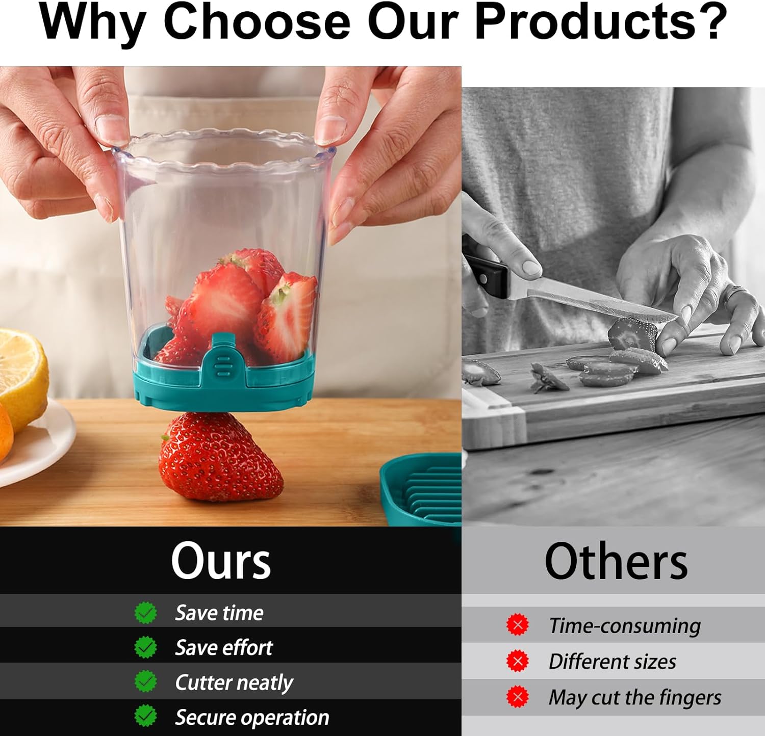 - Fruits Slicer: Fruit Slicers 8 times faster than a knife! Our fruit cutter makes prep a breeze. Easily cut 18 strawberries in 9 seconds, saving you time and energy. With this fruit chopper you can easily slice fruits and vegetables into more uniform shapes, save your time and make slicing fruits a breeze.