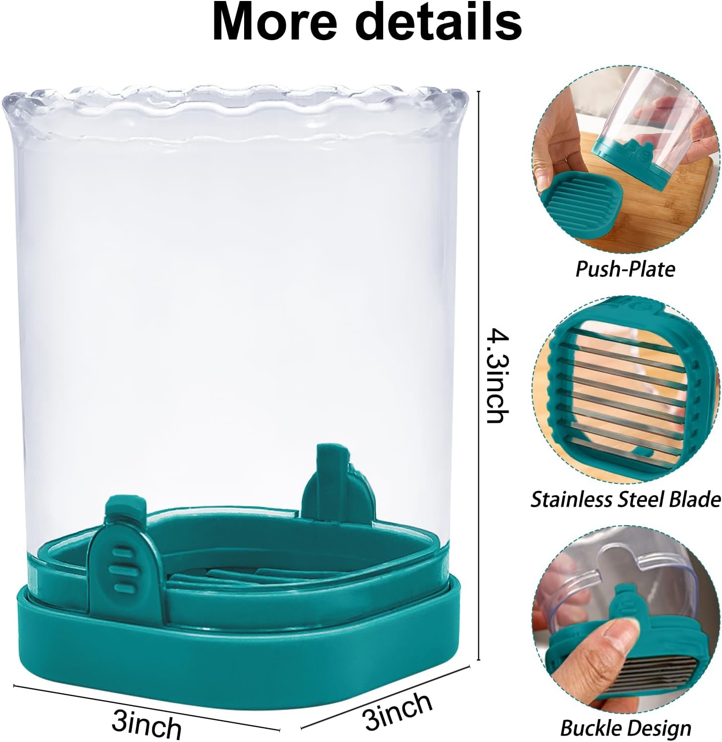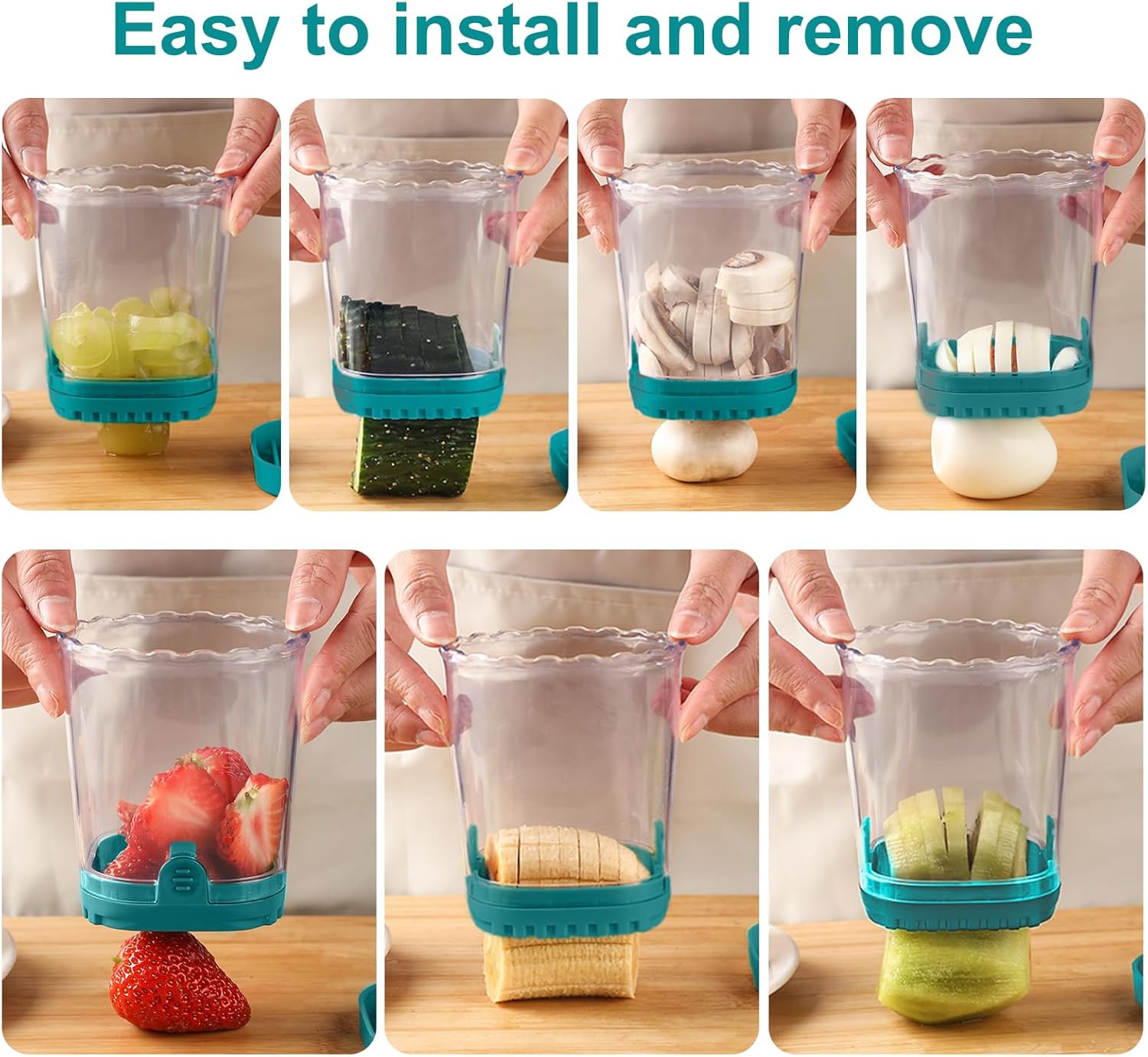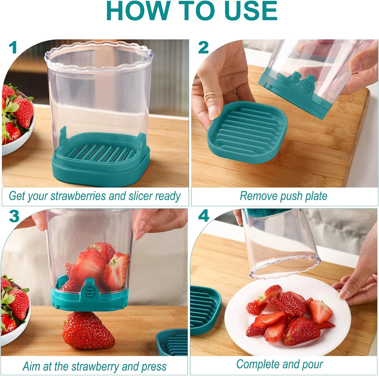 - Strawberry Slicer: The fruit slicer cup comes with a bottom base after cutting, place it on the base to push out any excess stuck food. larger-capacity fruit cutter slicer can slice multiple strawberries at one time. Strawberry slicer kitchen gadget can be in direct contact with food
