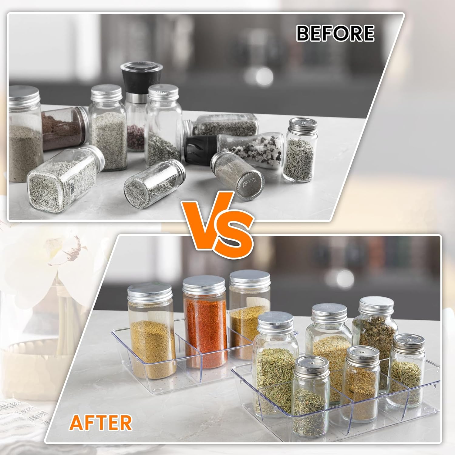 - REMOVABLE DIVIDERS: There are two acrylic drawer organizers in each set that come with 3 removable dividers. You can easily put similar items, such as snacks, cosmetics, office supplies in one tray, divided by color, size, type and so on. DIY design according to your usage needs!