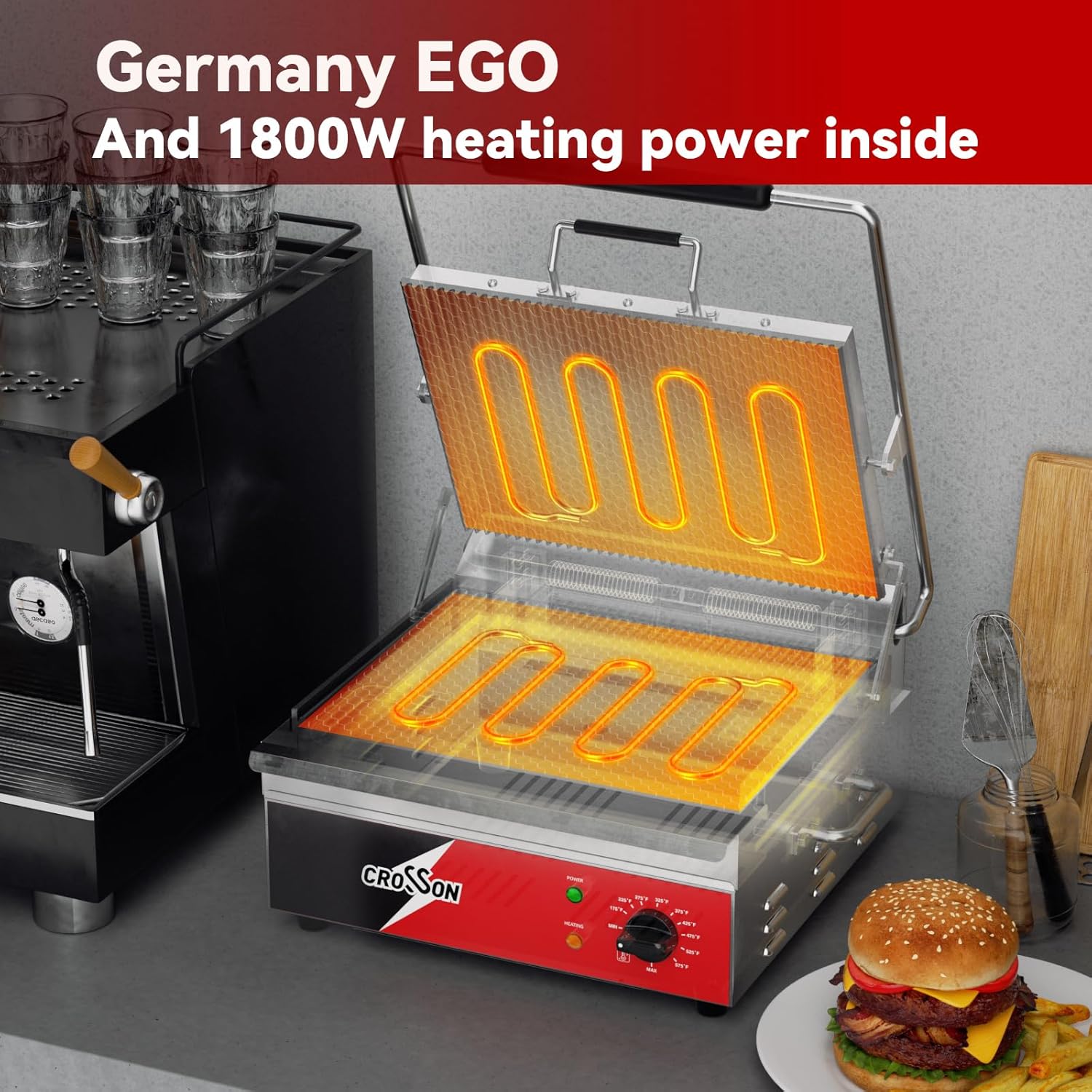 CROSSON 15"×11" Ribbed ETL Listed Commercial Electric Panini Grill,Hinged Auto Leveling Top Plate Panini Press Sandwitch Maker