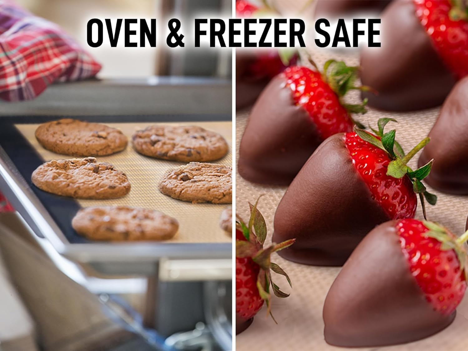 - DURABLE & FOOD-SAFE SILICONE: Crafted from premium food-grade silicone, these baking mats are strong, flexible, and can handle temperatures up to 480Β°F. Use them in ovens, microwaves, and freezers with confidence. Designed for long-lasting durability, our mats are scratch-resistant and BPA-free - No plasticky aftertaste.