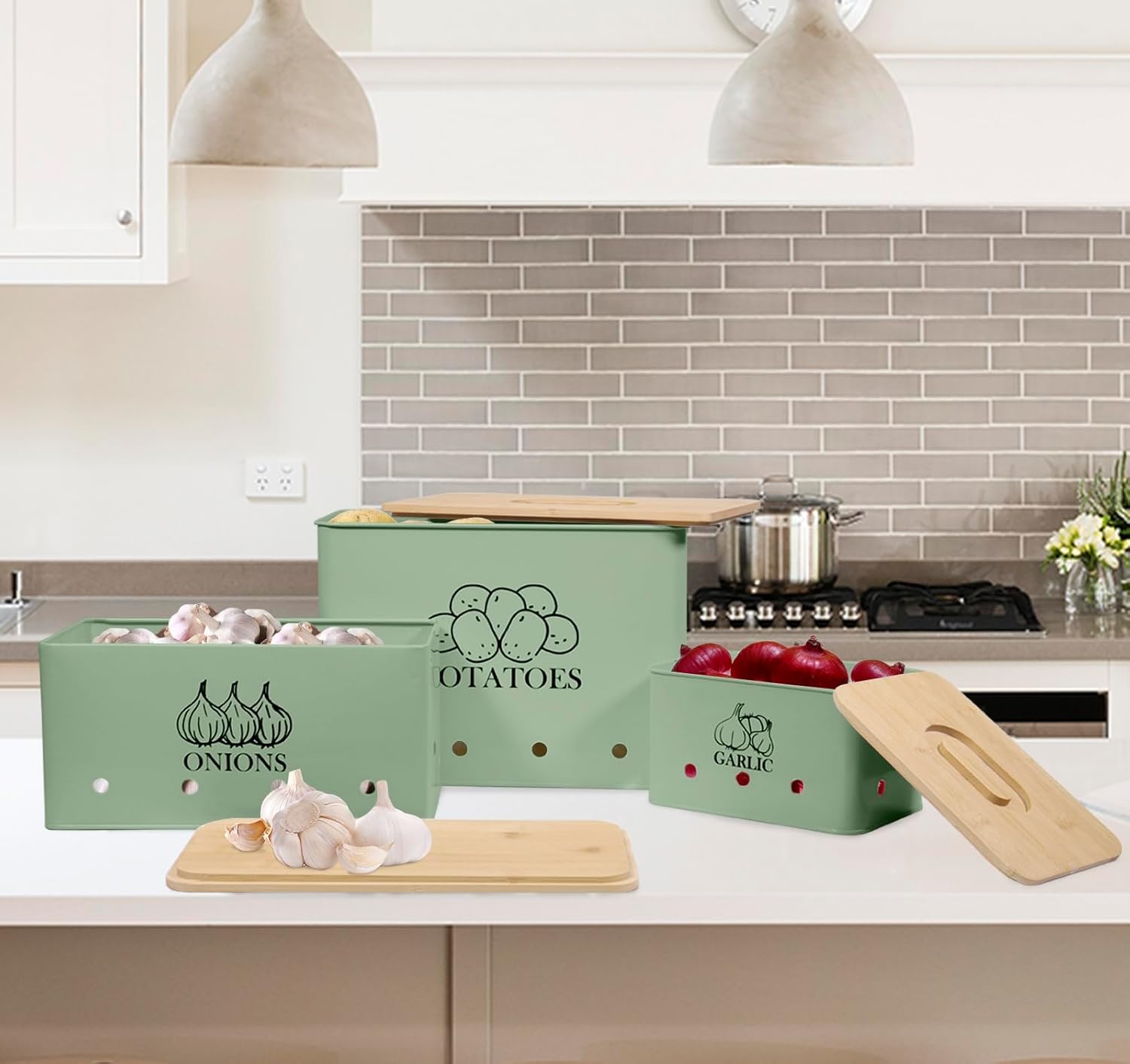 - HIGH CAPACITY - With a deep storage area, the storage tin should have more than enough capacity to cater to your average home cooked meals, each bin has a matching lid. Potato onion garlic canisters jars also can storage garlic, vegetables and fruit etc.