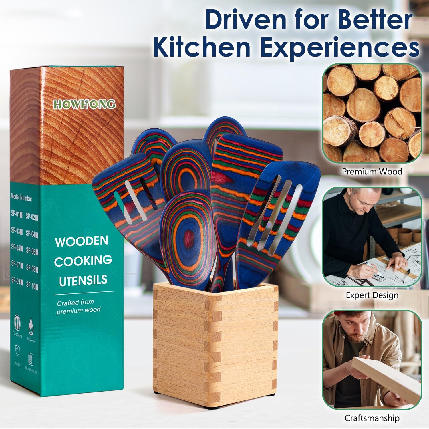 Kitchen Pakkawood Wooden Spoons for Cooking – 7-Piece Kitchen Utensil Set with Spatula, Corner Spoon, Rice Paddle – Nonstick Safe Durable Wooden Cooking Tools for Home Kitchen (Spectrum) by Howhong