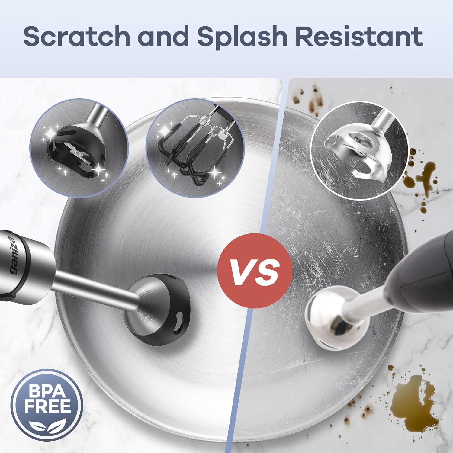 - No More Lumps and Scratches: Featuring SUS 304 stainless steel 4-leaf blade, this immersion blender handheld turns sauces and soups into velvety smooth textures effortlessly. The upgraded scratch-resistant blade guard protects your favorite pots and pans from scratches. Say goodbye to lumpy chunks and scratched-up cookware!