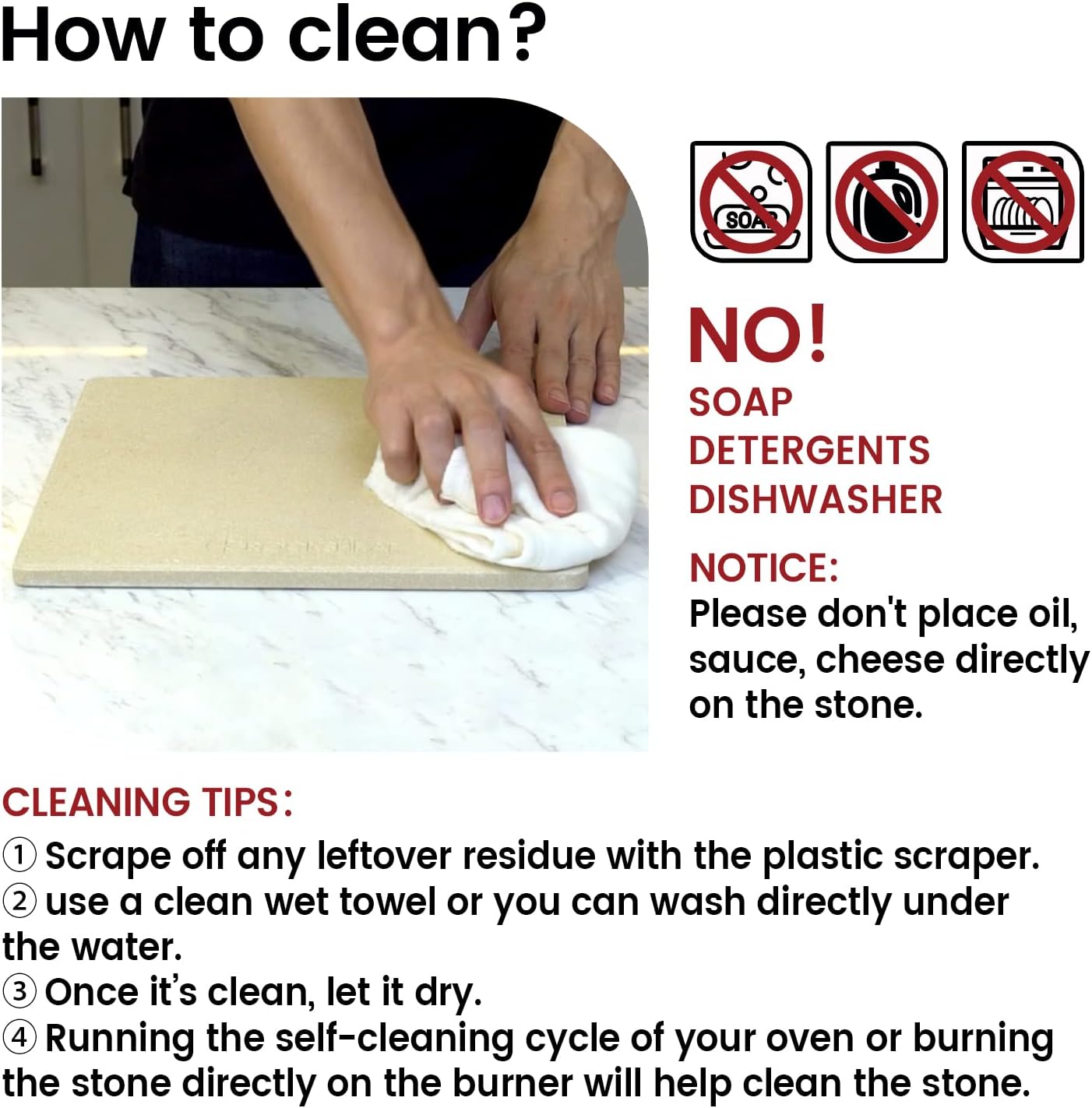 - FDA, RoHS, LFGB, etc CERTIFICATED. This stone is burned in 2200โ kiln, it doesn't contain any harmful substance and has no odor. (Never use soap or detergent to clean the stone! Never season cordierite stone with oil or grease)