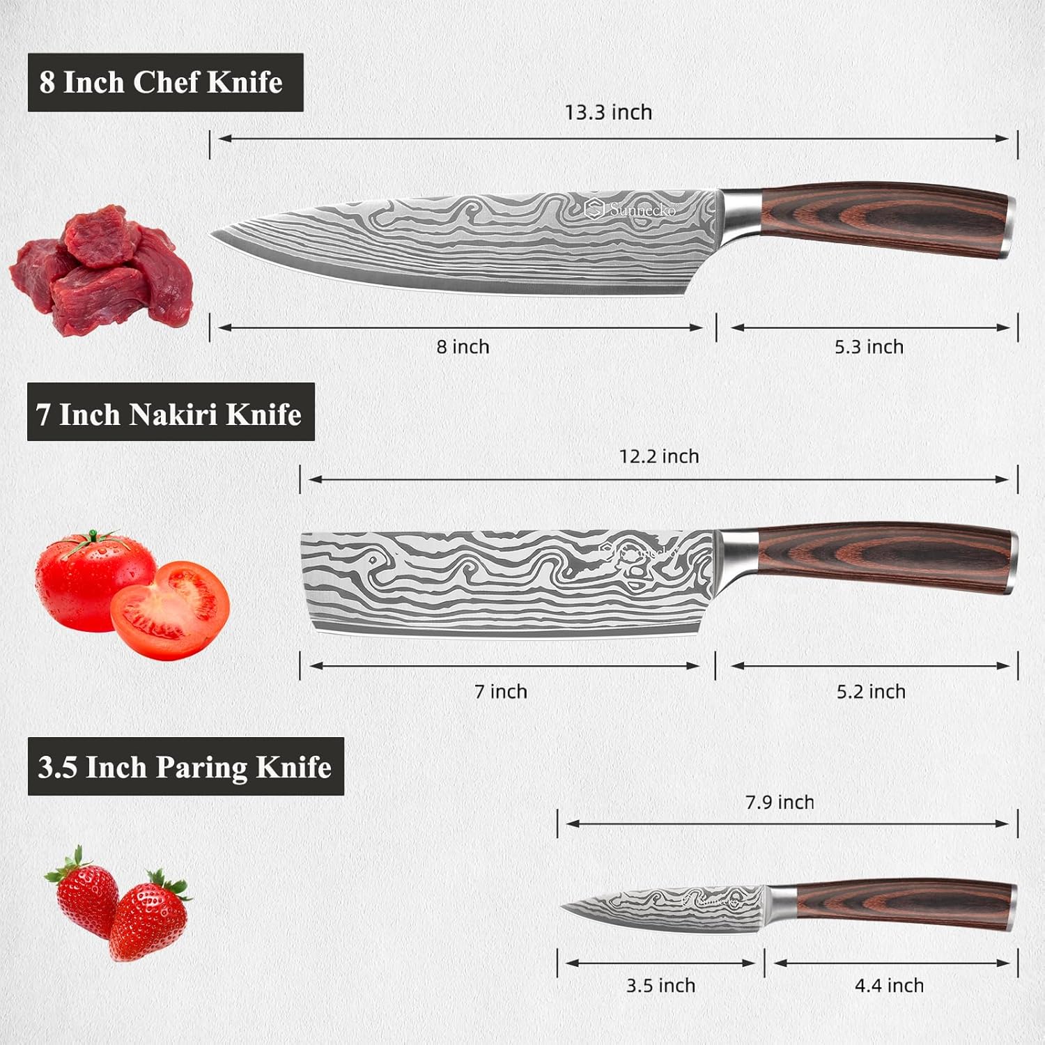 - Versatile Knife Set: This comprehensive knives set of 3 includes an 8-inch chef knife, a 7-inch Nakiri knife and a 3.5-inch paring knife. The knives set for kitchen is expertly designed to handle various tasks with ease, suitable for cooking enthusiast and home cook.