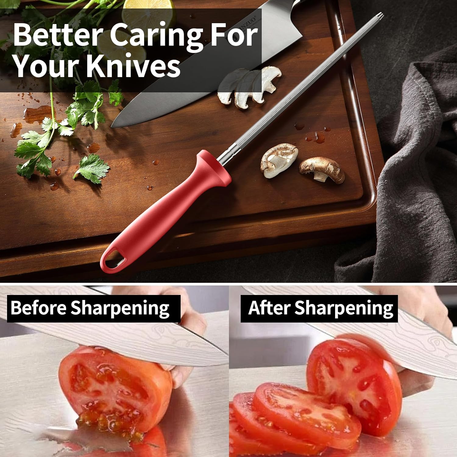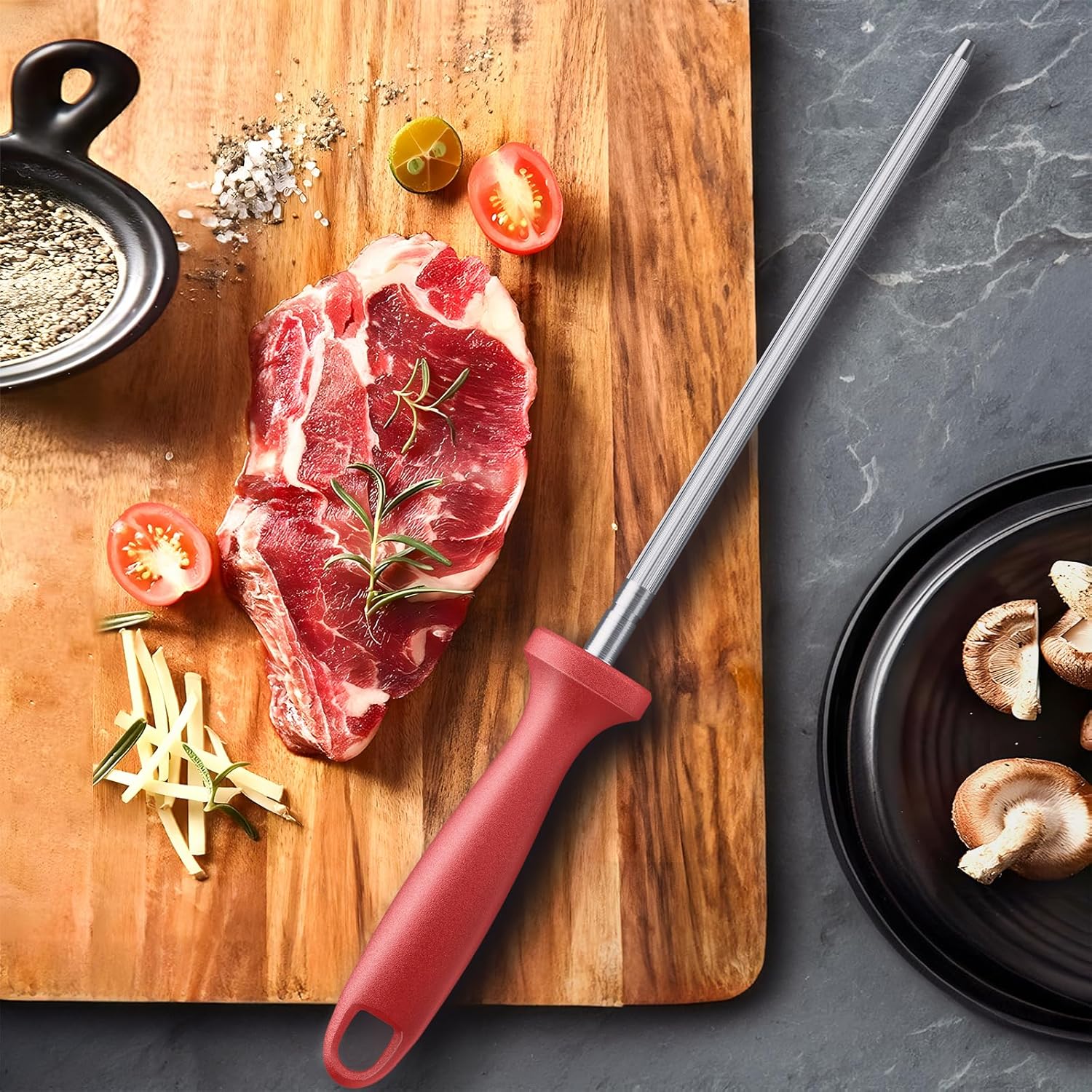 Knife Sharpener Rod, Kitchen Knives Sharpener Carbon Steel Professional Knife Sharpening Steel, Red Diamond Honing Rod with Hanging Holes (13 inches)