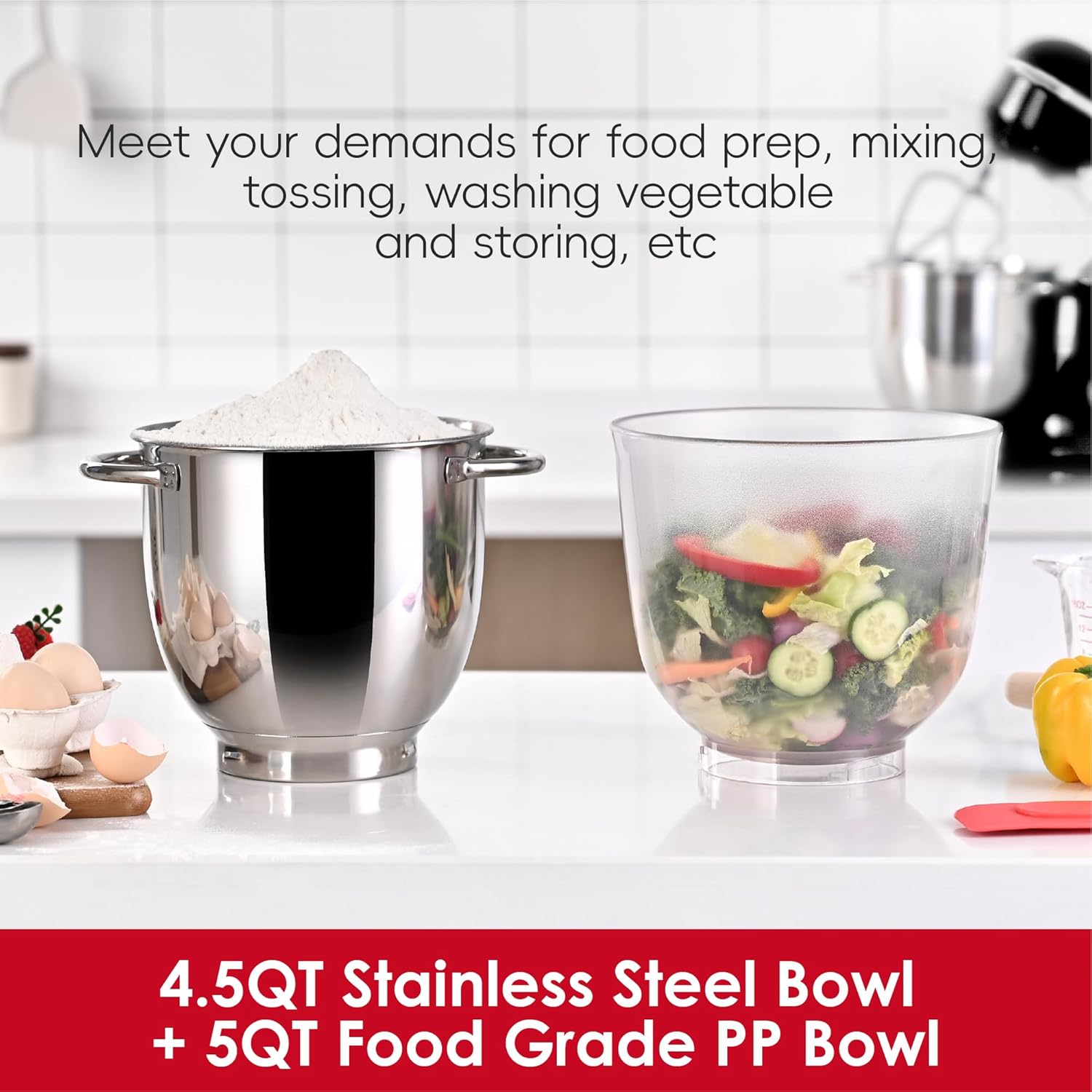 - 4.5QT+5QT Two Mixing Bowls- Our Stand mixer equipped with 4.5Qt stainless steel bowl and 5QT extra food safe plastic mixing bowls, perfect for a variety of mixing and baking needs. Special Nesting design for nest two bowls together and offer space-efficient storage.