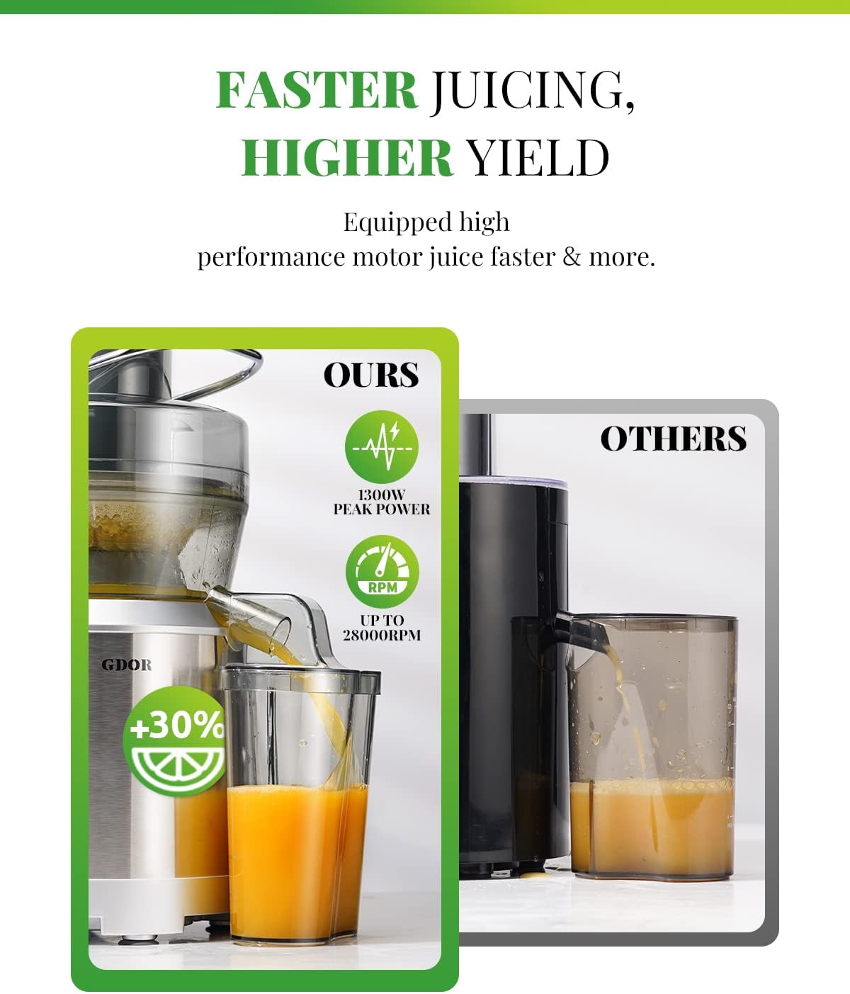 - Better Juice, Healthier Life - The GDOR Heavy Duty Centrifugal Juicer Machines with 3.2" Feed Chute saves prepare time. Maximum power 1300W strong full copper motor and enhanced titanium blades process foods in just seconds. Besides, a 27 oz juice jug and a cleaning brush are both included!