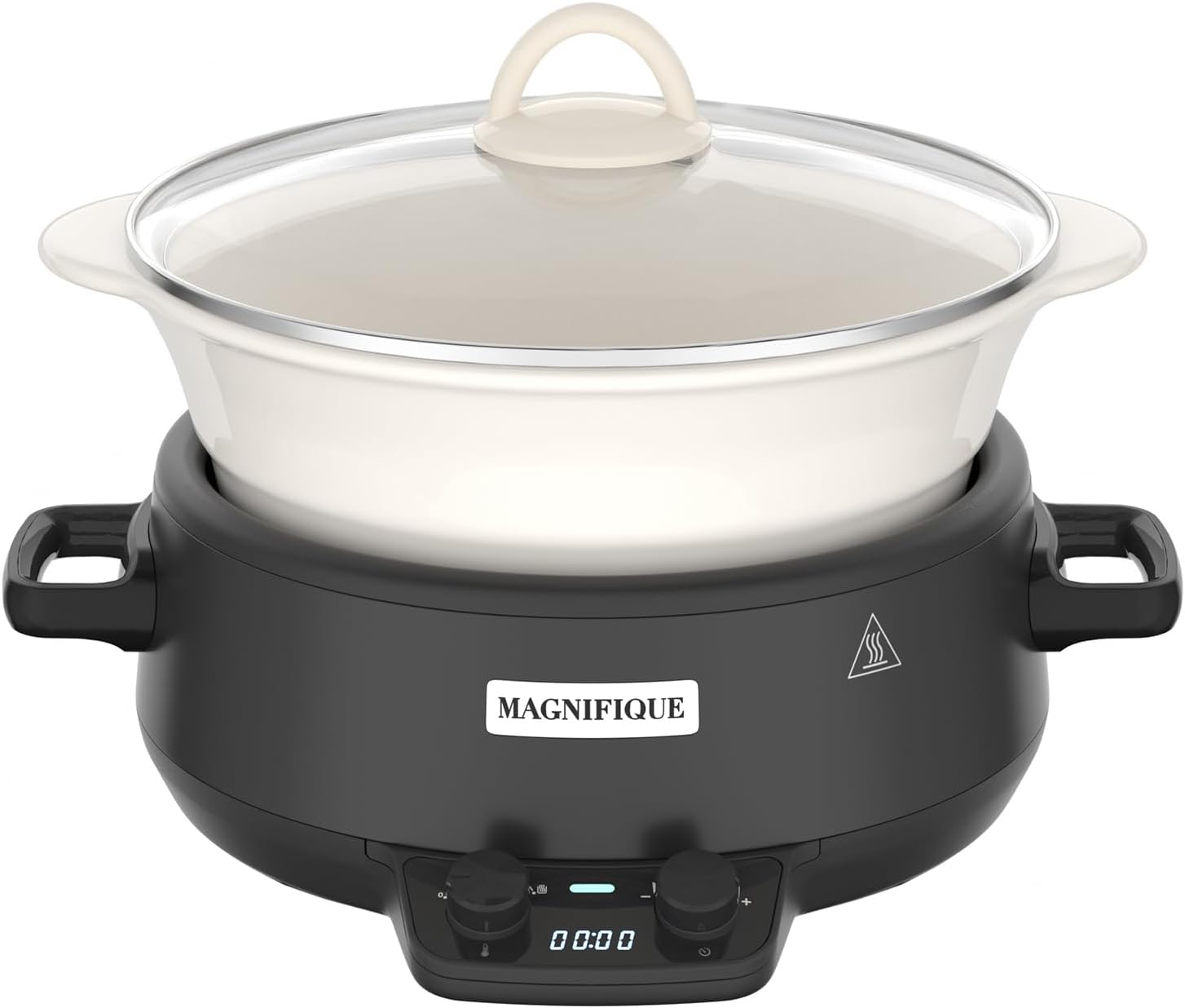 MAGNIFIQUE 5 Quart Programmable Slow Cooker with Auto Warm Setting, Glazed Ceramic Liner, Kitchen Small Appliance for Family Dinners, Black