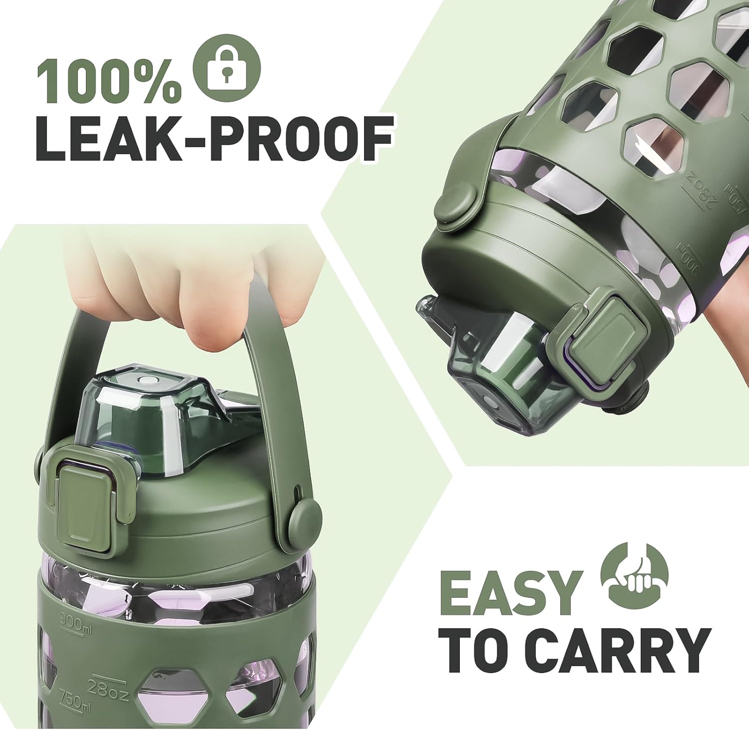 MUKOKO 32 oz Glass Tumbler with Straw,Glass Water Bottles with Time Marker,Iced Coffee Cup with 2 Lids-Handle Spout Lid&Straw Lid,Silicone Sleeve,Leakproof,1 Pack-Olive