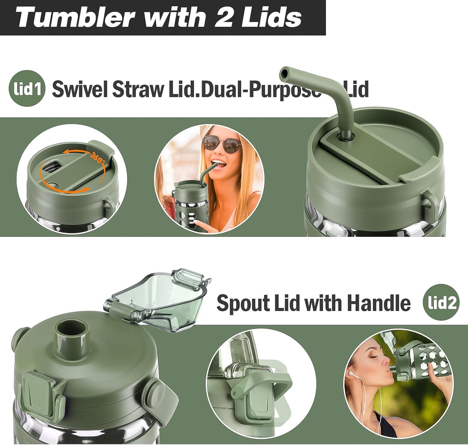 - TWO LID DESIGNS:Whether you prefer small sips or maximum thirst quenching.-Straw lid.Swivel lid with three positions: straw opening designed to prevent splashing and seals to hold reusable straws in place,beverage opening for straight sipping,full lid top for added leakage protection.-Leak-proof spout handle lid.The spout enables smooth liquid flow and the handle attached to the lid allows for easy carrying on the go.Suitable for gym and outdoors.