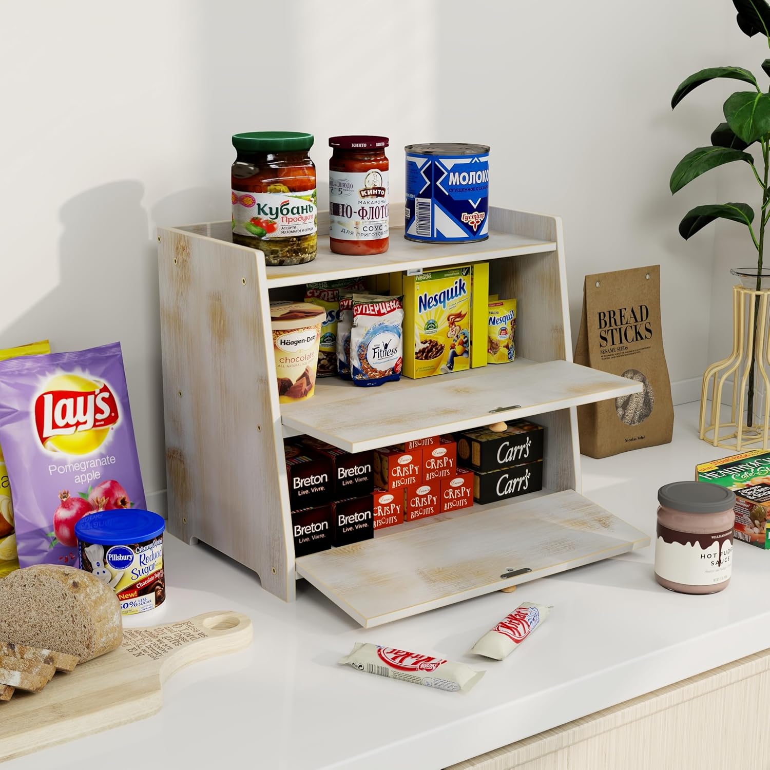 Vintage Double Layer Bread Box for Kitchen Counter Bamboo Bread Storage Container Large Capacity Bread Storage Bin (Antique White)