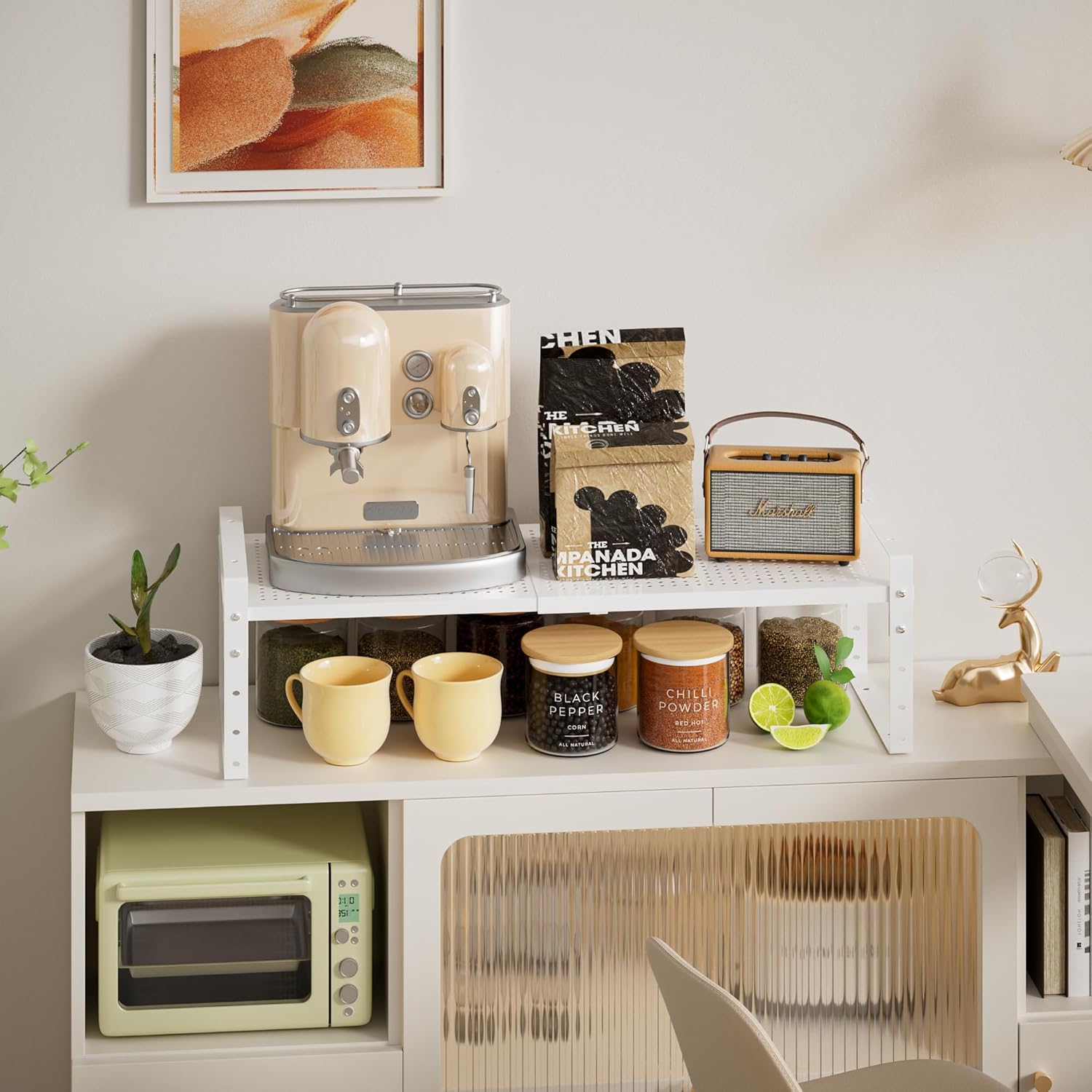 - ⭐【Flexible retractable design (Expandable & Adjustable)】This kitchen shelf uses a retractable design, which can be freely adjusted according to the size of the kitchen space and personal needs. Whether it is a narrow corner or a spacious storage room, it can be easily adapted to make the most of every inch of space.(10.1"D x 16.54"W~26.38"W x 6.22"H)