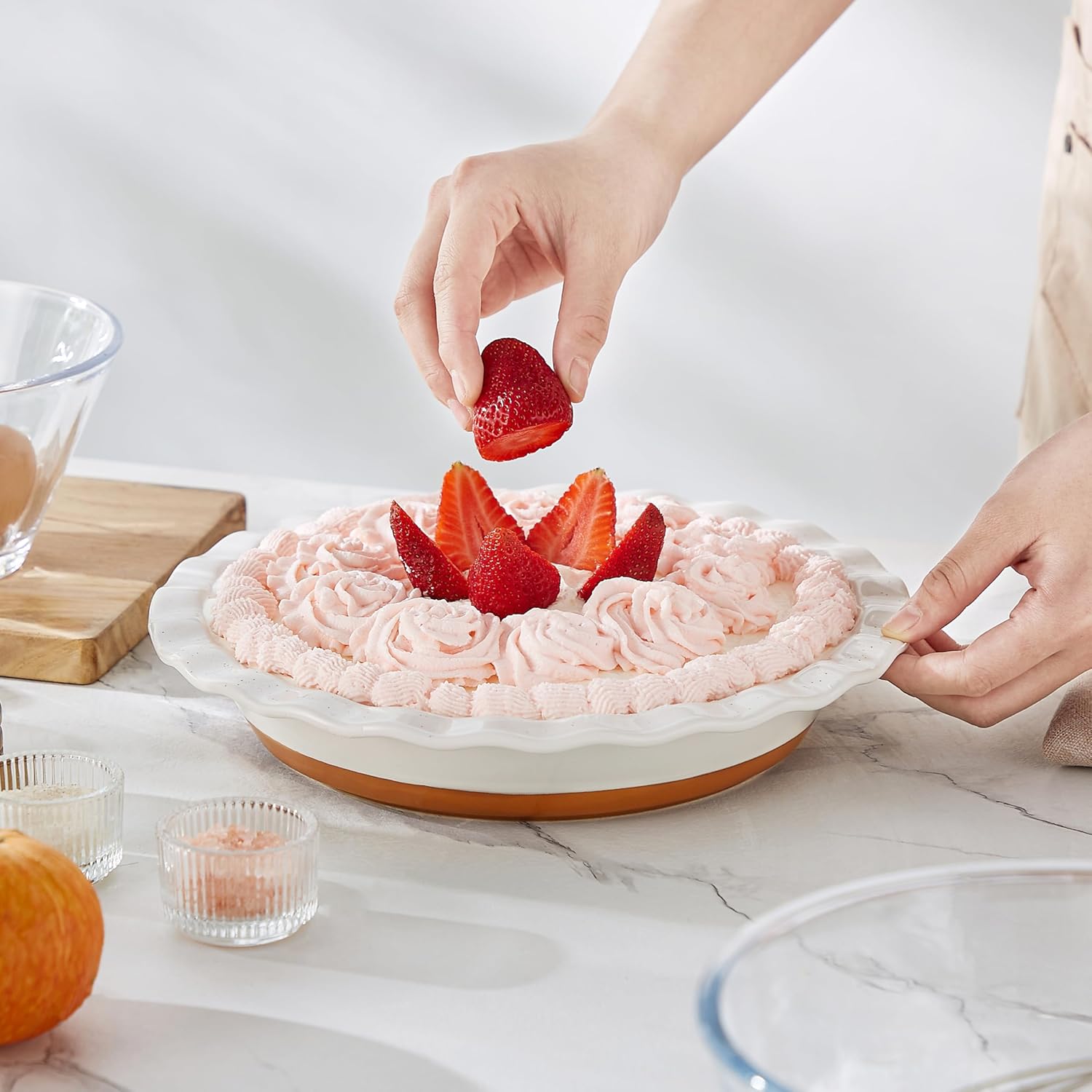 - 【High-Quality Stoneware Construction】Made from durable stoneware, this deep pie pan ensures long-lasting performance and even heat distribution for perfectly baked crusts and fillings. It withstands high temperatures and maintains its beautiful appearance over time.
