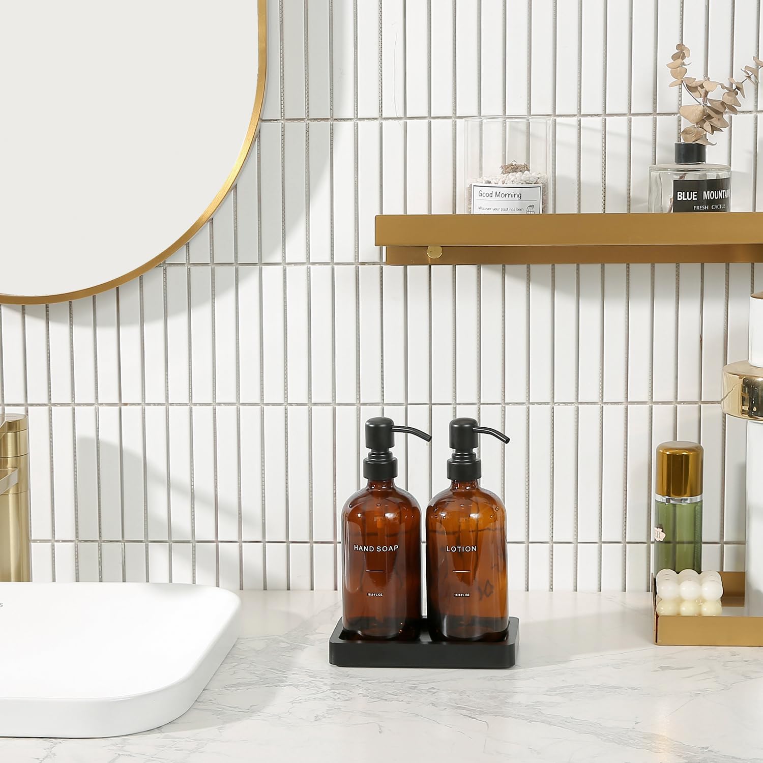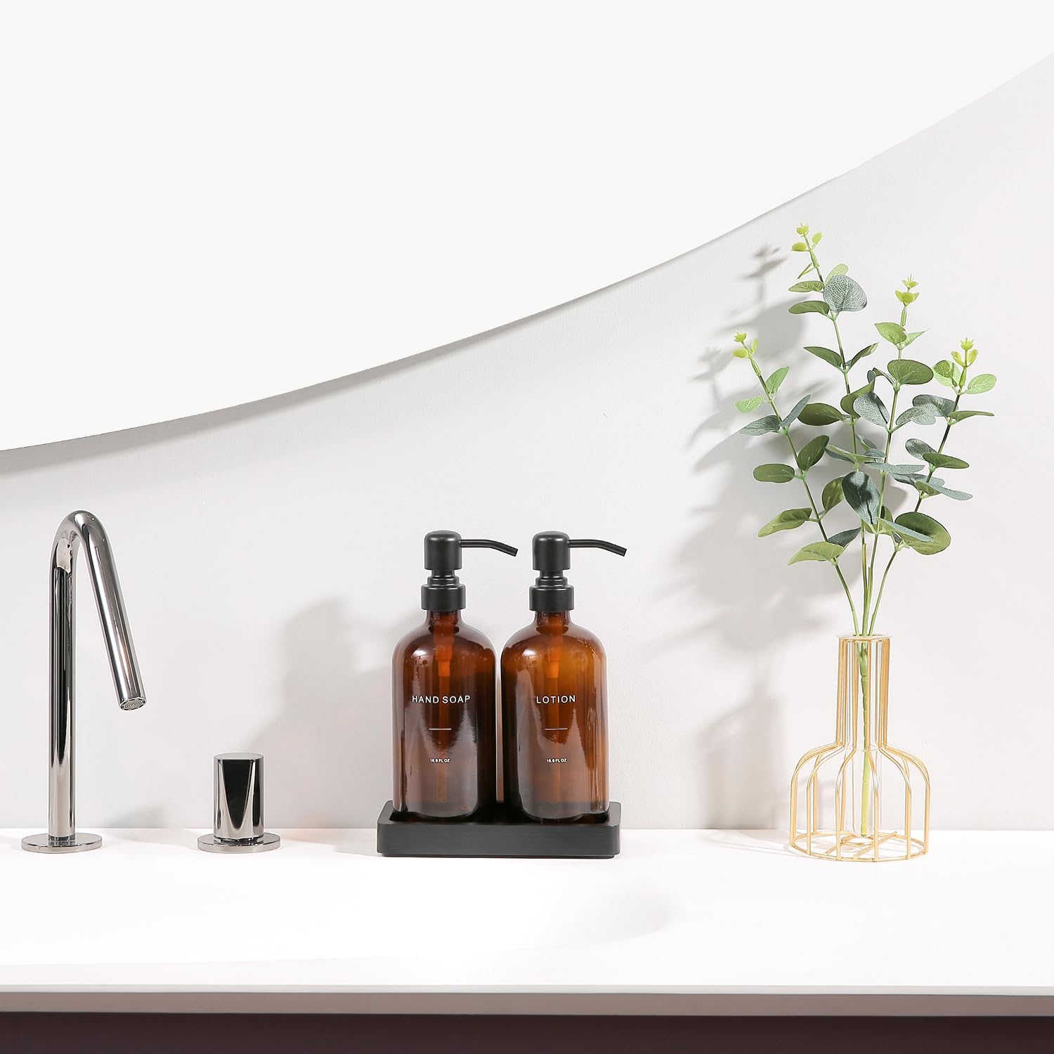 Amber Glass Soap Dispenser Set, Hand Soap and Lotion Set with Black Stainless Steel Pump, Perfect for Modern Bathroom Decor. (Amber)