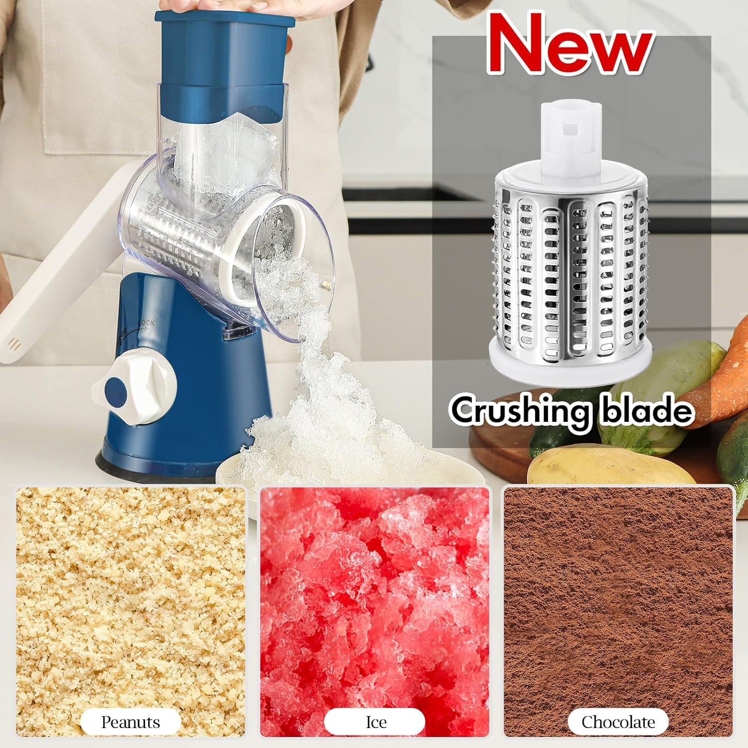 - Our cheese grater hand crank to meet most of your kitchen needs: The rotary cheese grater is ideal for grating cheese, ice, potato, carrot, cucumber, zucchini, cabbage, radish, nuts, chocolate, broccoli, etc. for pizza, salad, cauliflower rice and so on