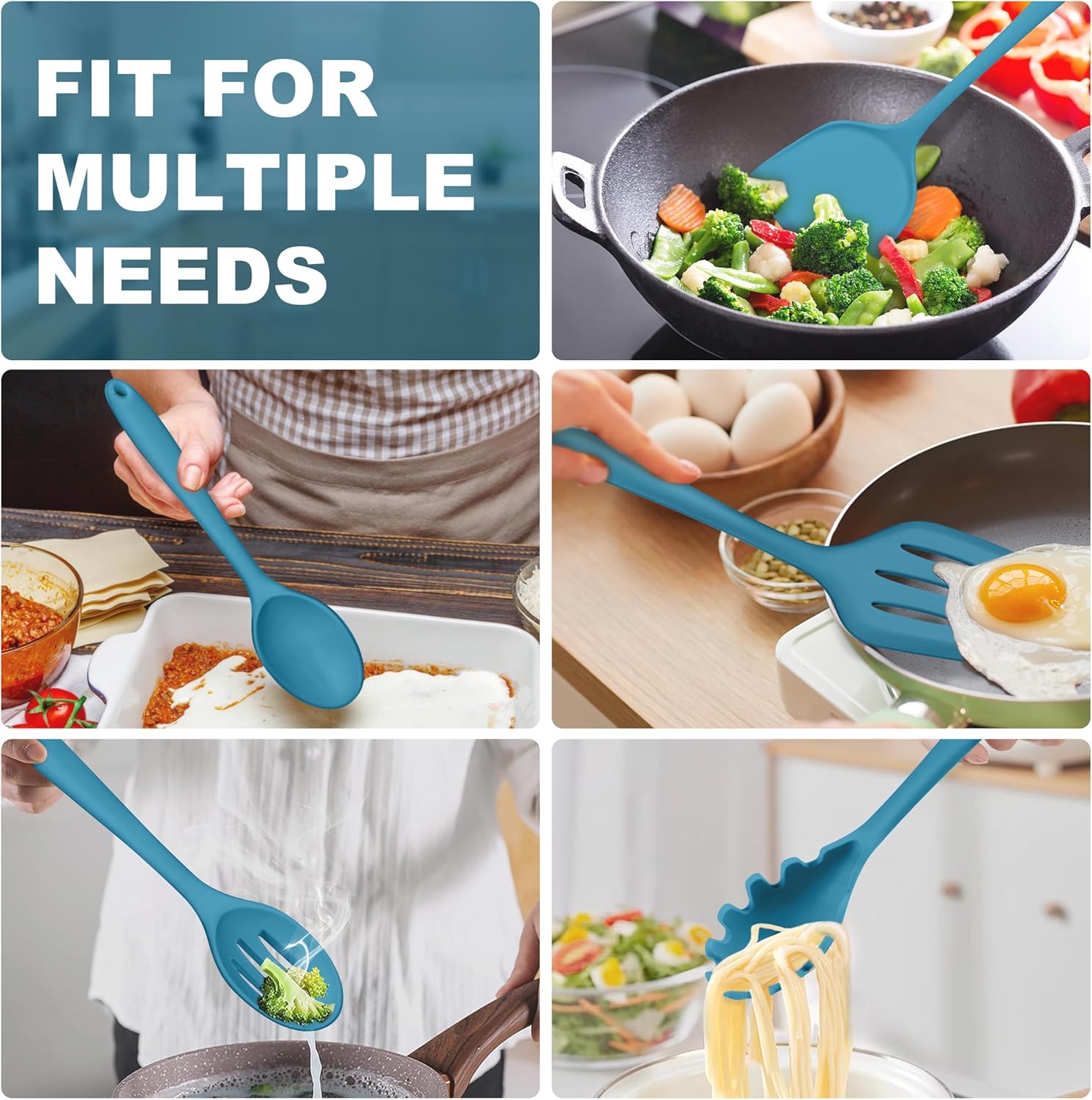- 5 PIECE SET: Silicone cooking utensils set with different sizes and shapes for its’ various functions, Slotted and solid turner for frying, turning, flipping, Solid and slotted spoon for cooking, mixing, draining, Pasta Server for serving pasta, Great combination for cooking, Fit nicely for Housewarming / Thanksgiving / Birthday, etc.