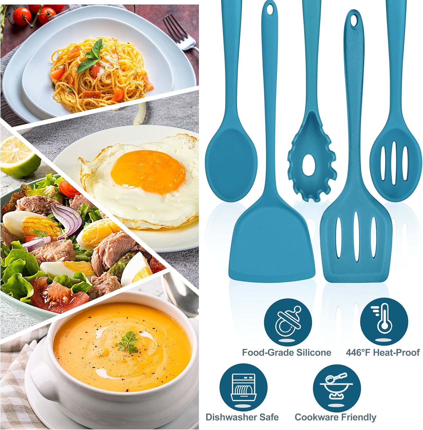 - HEALTHY & HEAT-RESISTANT: The cooking utensils are made of healthy food grade silicone without harmful substances, Won’t release pungent smell and would not react with your foods, Withstand high temperature up to 446°F, Not easy to melt or burn when using in the high temp or boiling water, Safe and sturdy for daily cooking use