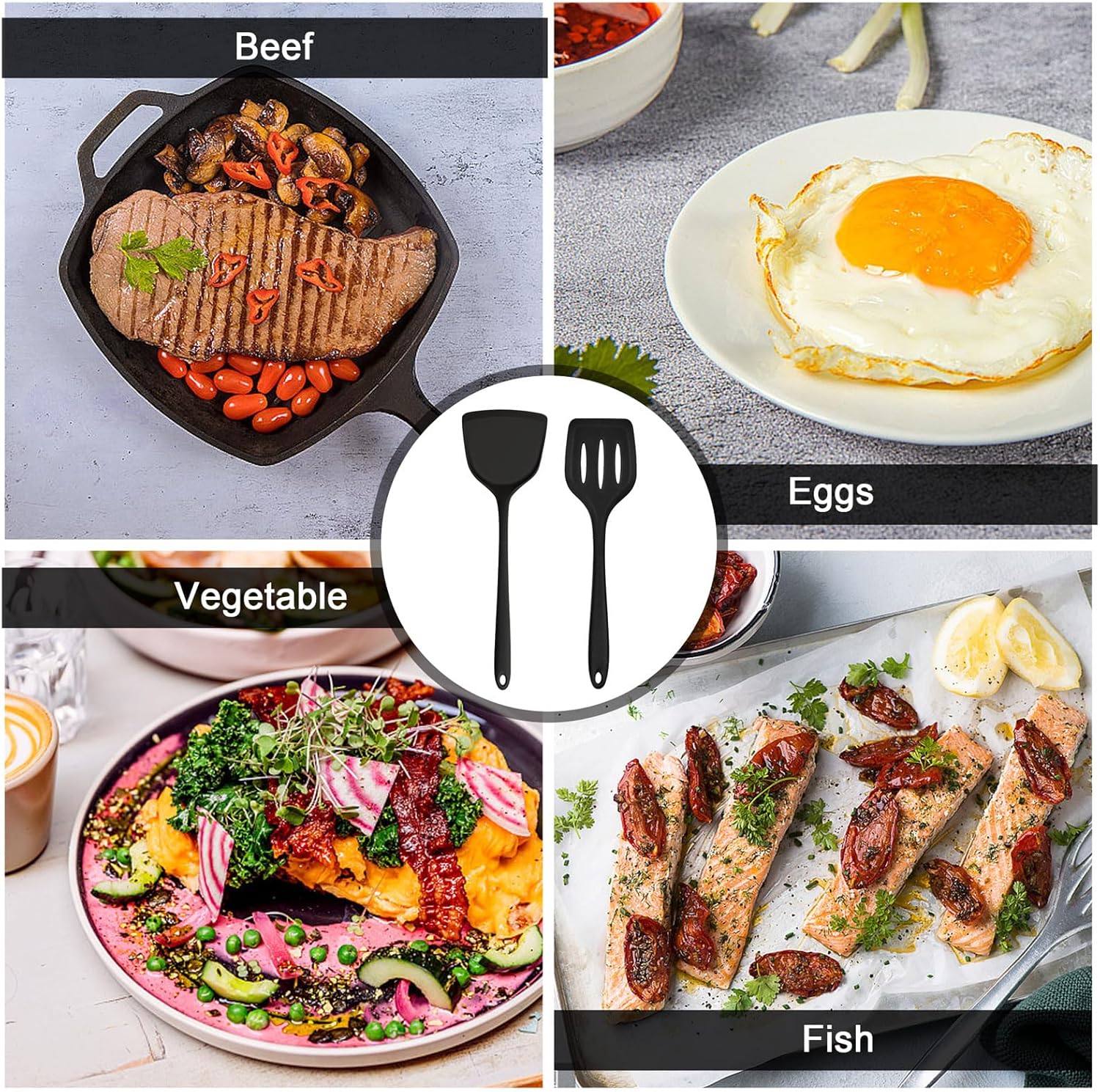 - MULTI-FUNCTIONS: Silicone solid & slotted cooking turner with different sizes and shapes for its’ various functions, Fit nicely for frying, turning, flipping, serving, For cooking eggs/ beef/ fish/ vegetable, Great combination for daily cooking and for Housewarming / Thanksgiving / Birthday, etc.