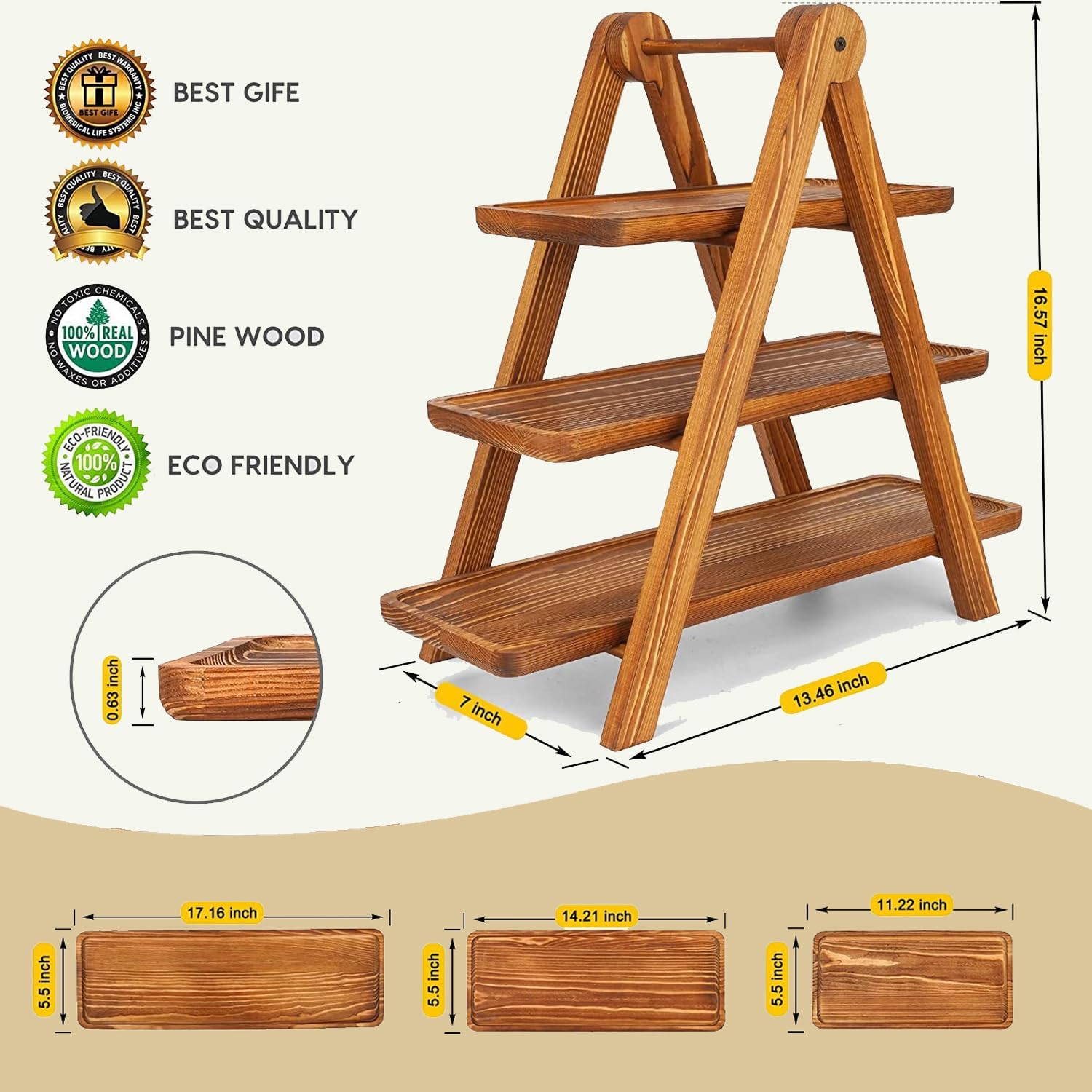 - Serving Tray Structure and Dimensions: This Serving Tray has a Detachable 3-tier structure,Stand with 3 rectangular trays of various sizes and 1 ladder rack,You can use it with the rack or use the wooden tray alone!The large tray 17" x 5.5" the medium tray 14"x 5.5" and the small tray 11"x 5.5",the ladder rack 13.46"x7"x17.04". accommodating a range of dessert sizes. The 4-inch spacing between tiers provides ample room for showcasing cakes, fruits, snacks, and other foods.