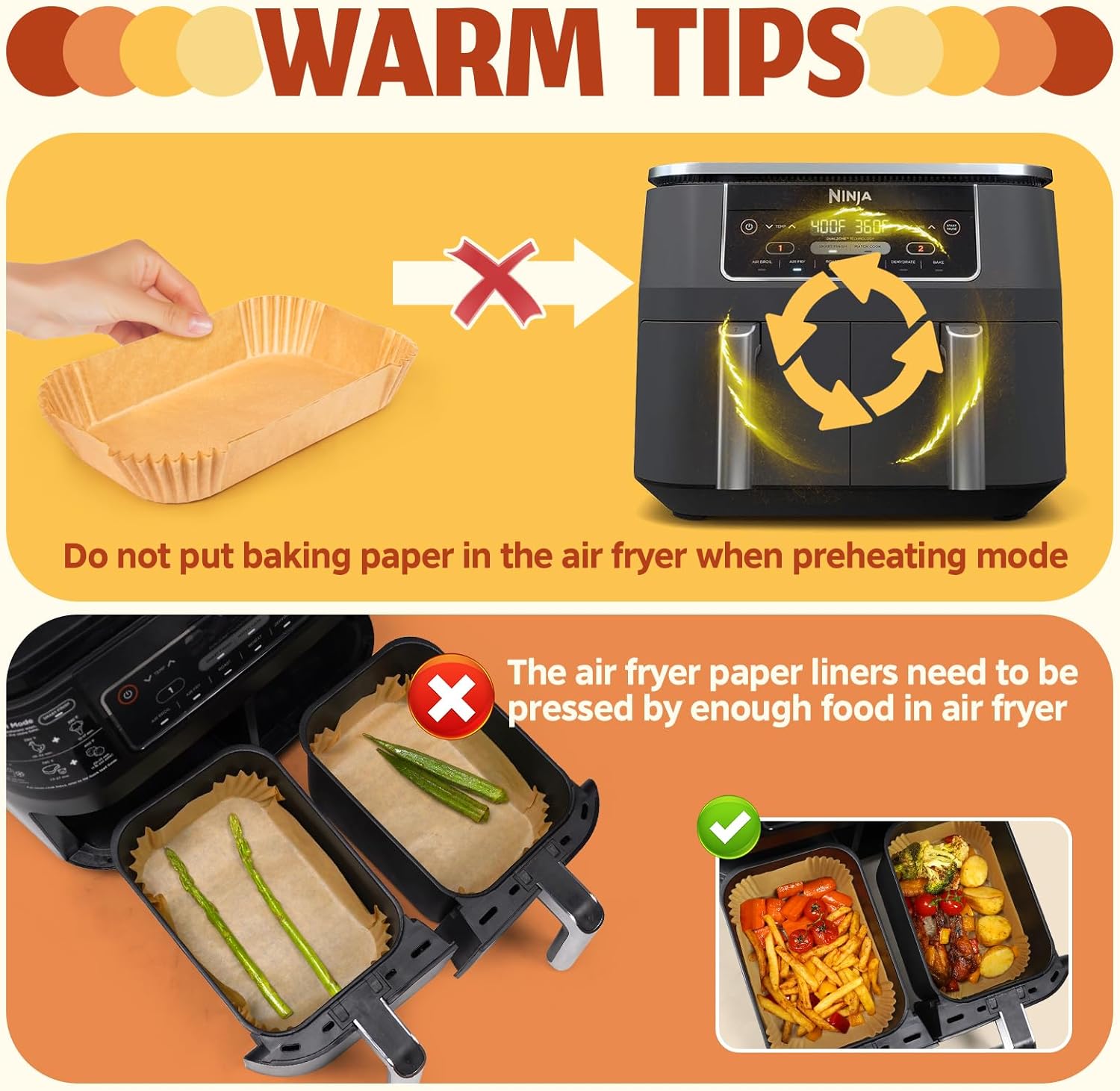 - Heat Resistant Up To 450Β°F/230Β°C: Elevate your cooking with our parchment paper for air fryer, tailored for Ninja air fryers. Crafted from untreated wood with a silicone coating, With a water-proof, oil-proof, non-stick, and heat-resistant design, they ensure health cooking every time. Remember, when using the air fryer paper, Please do not put the airfryer liners in the air fryers while preheating! always try to fill it with food as much as possible
